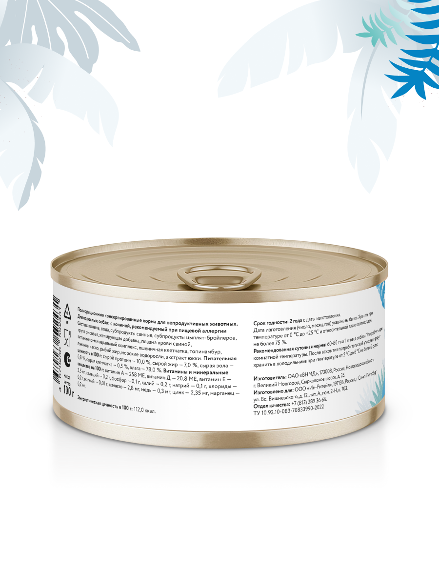 Состав: конина, вода, субпродукты свиные, субпродукты цыплят-бройлеров, крупа рисовая, желирующая добавка, плазма крови свиной, витаминно-минеральный комплекс, пшеничная клетчатка, топинамбур, льняное масло, рыбий жир, морские водоросли, экстракт юкки.