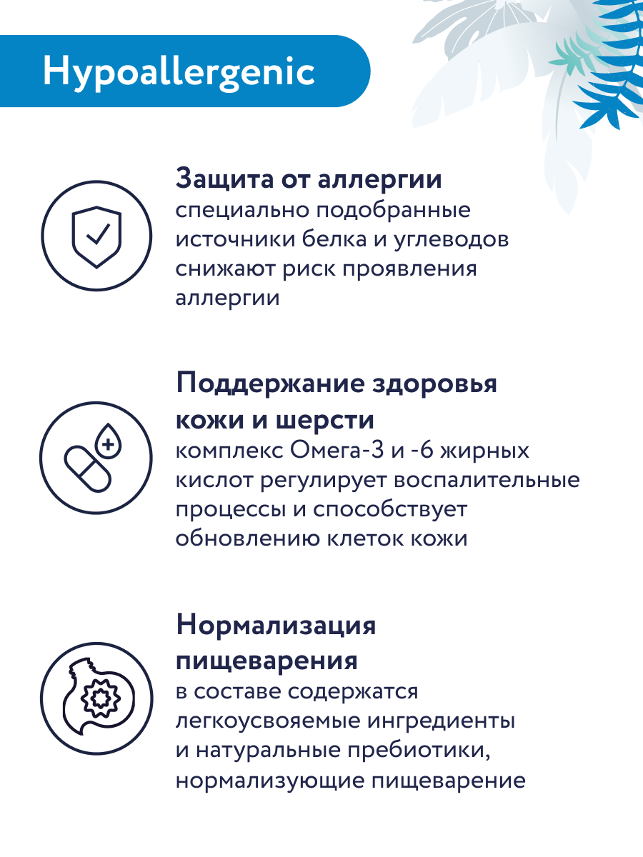 | Особые потребности | беззерновой, гипоаллергенный, для здоровья кожи и блеска шерсти, для здоровья костей и суставов, для профилактики МКБ, для снижения запаха стула, для ухода за ротовой полостью, при склонности к избыточному весу, при чувствительном пищеварении |