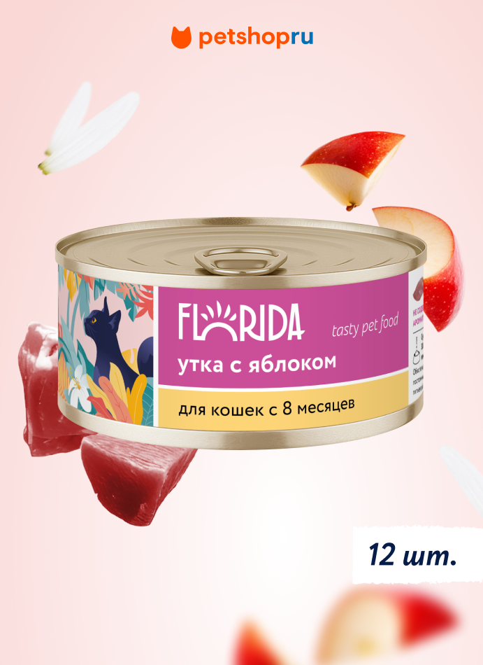 FLORIDA Консервы для кошек «Утка с яблоком», 12 шт по 100 г Влажный корм: сравнение цен, характеристики, фото, актуальное наличие и цены.