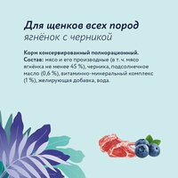 Состав: мясо и его производные (в т. ч. мясо ягнёнка не менее 45%), черника, подсолнечное масло 0,6%, витаминно-минеральный комплекс 1%, желирующая добавка, вода.