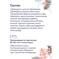 Обновлённый состав: субпродукты цыплят-бройлеров, субпродукты свиные, мясо птицы механической обвалки (индейки), вода, перепелка, крупа рисовая, плазма крови свиной, желирующая добавка, витаминно-минеральный комплекс, яичный порошок куриный, масло льняное, таурин, морские водоросли, рыбий жир, дрожжи, экстракт юкки, топинамбур.