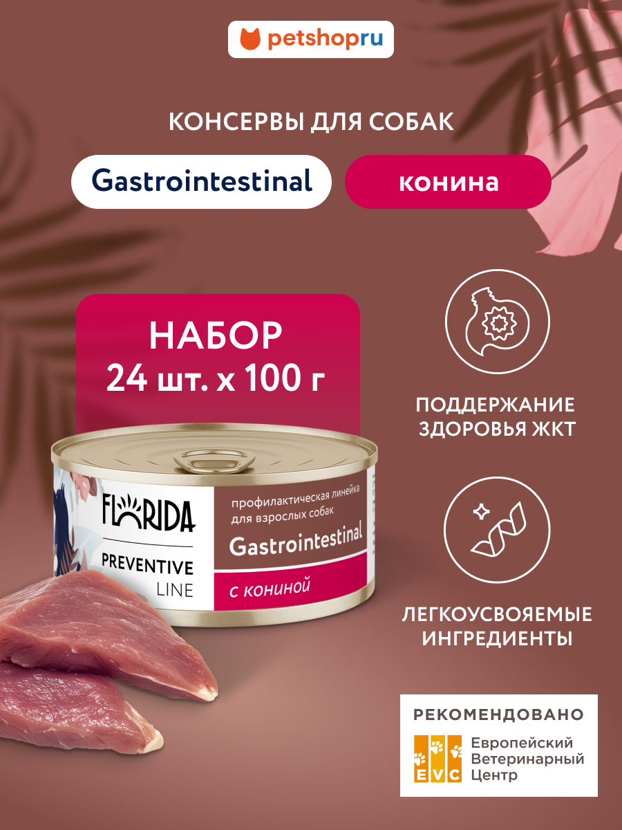 Florida Preventive Line Gastrointestinal Консервы для собак для поддержания здоровья пищеварительной системы, с кониной. Влажный, ветеринарный, диетический корм, 24 шт по 100 г: сравнение цен, характеристики, фото, актуальное наличие и цены.