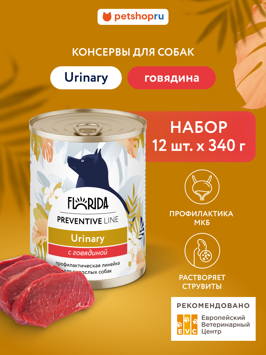 Мясные консервы Florida Preventive Line Urinary – это полнорационный сбалансированный корм для собак, предназначенный для поддержания здоровья мочевыделительной системы, профилактики мочекаменной болезни и образования струвитных уролитов.