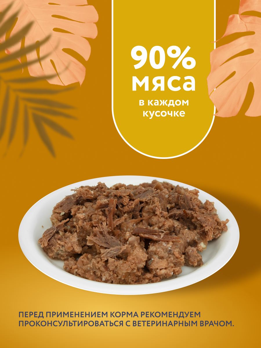 Состав: говядина, субпродукты говяжьи (сердце, печень, рубец, легкое), плазма крови, картофельный крахмал, яичный порошок, клетчатка, отруби пшеничные, масло льняное, рыбий жир, дрожжи, морские водоросли, топинамбур, юкка Шидигера, желе, метионин.