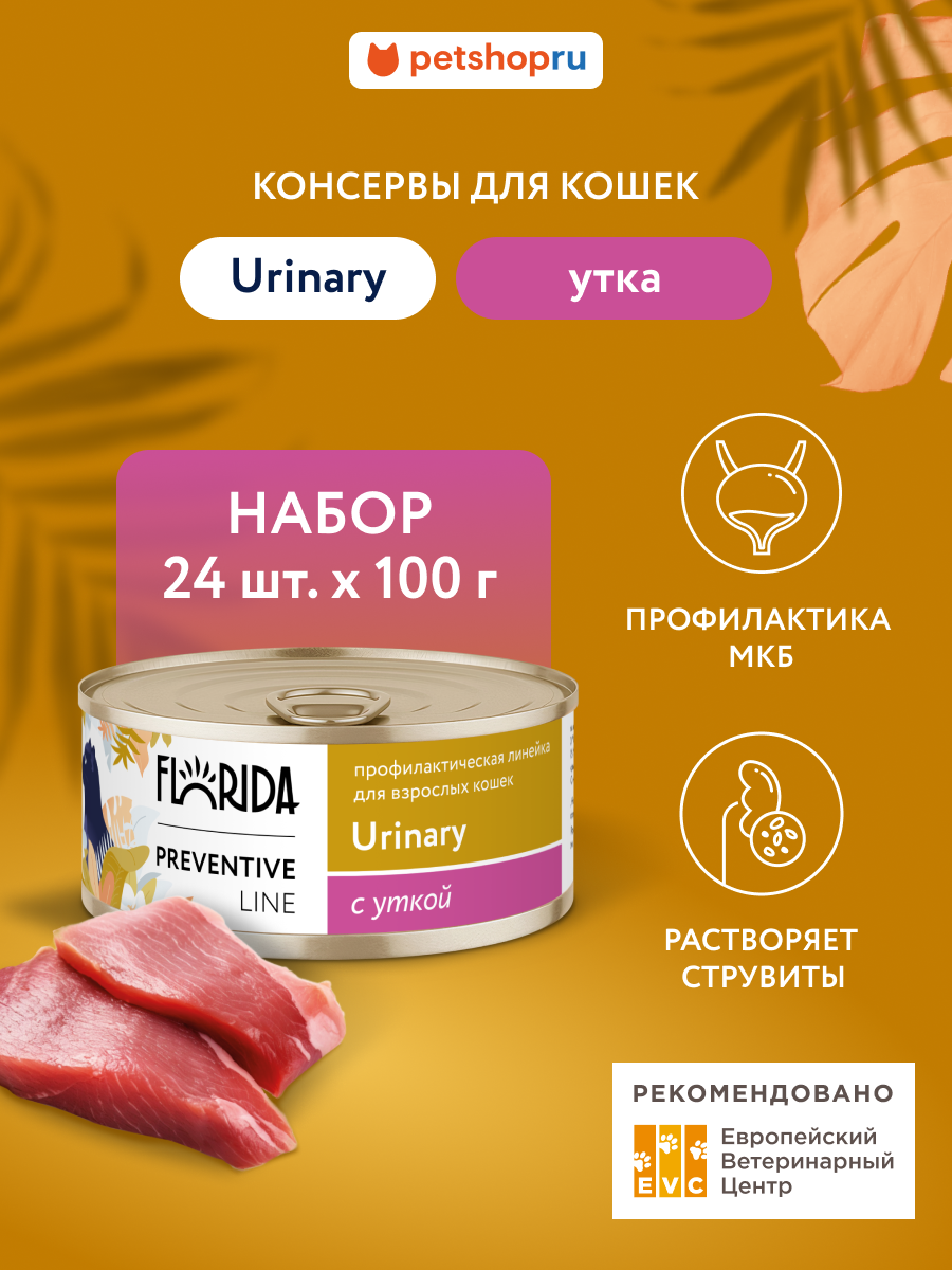 Florida Preventive Line Urinary Консервы для кошек для профилактики образования мочевых камней, с уткой. Влажный, ветеринарный, диетический корм, 24 шт по 100 г: сравнение цен, характеристики, фото, актуальное наличие и цены.