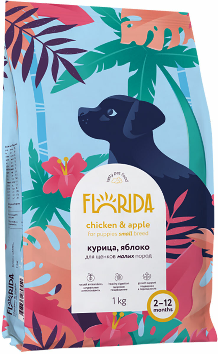 Florida Chicken and Apple - сухой корм супер-премиум-класса с курицей и яблоком для щенков малых пород с 2 до 12 месяцев. Сбалансированное полнорационное питание, способствующее гармоничному развитию щенка. В рационе кормов Florida используется только белок животного происхождения.
