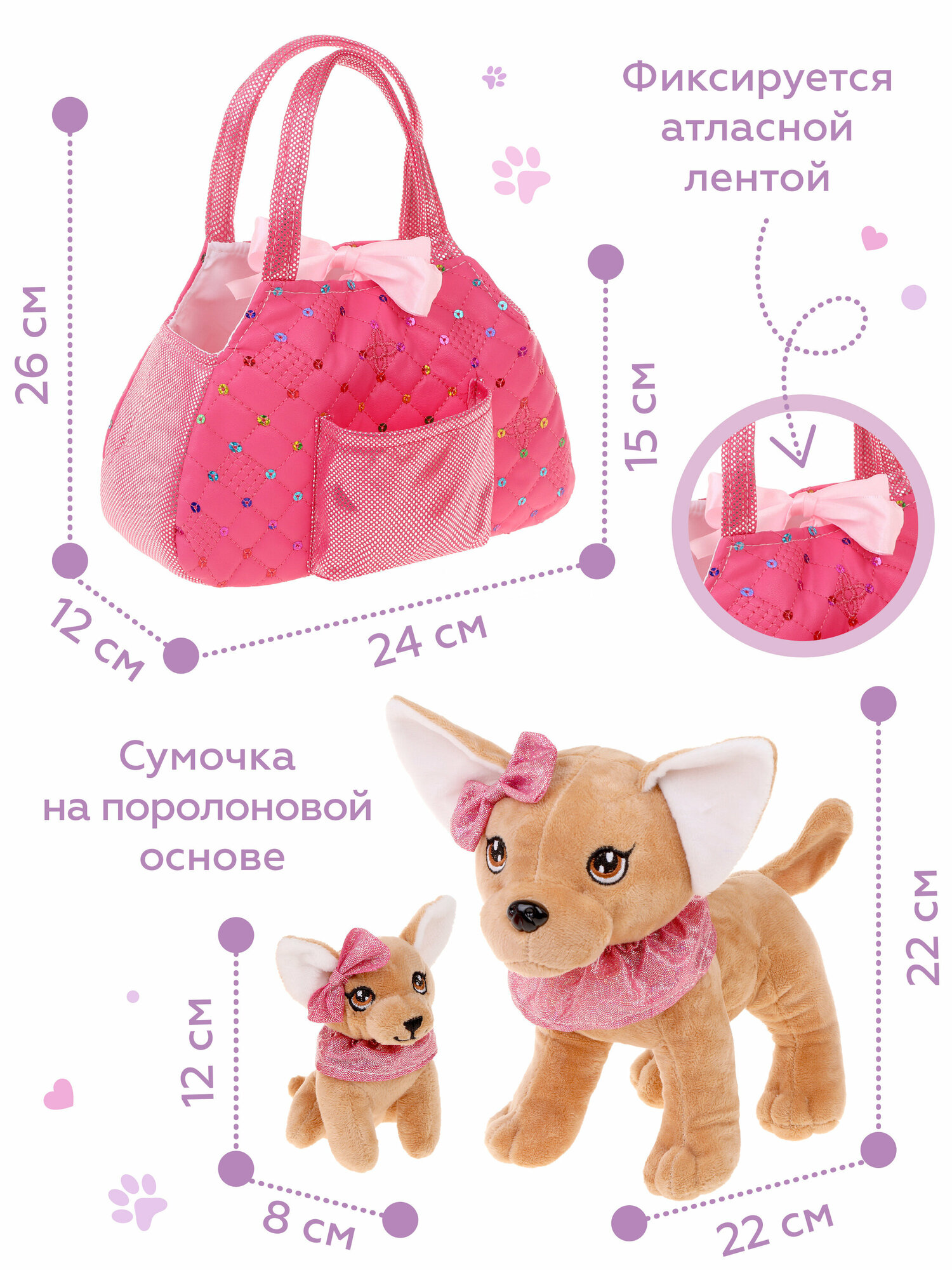 размеры игрушки: 19х10х17 см; размеры сумочки: 24х10х14.5 см