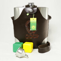 Большая походная металлическая фляжка в кожаном чехле с ремешком для ношения. Объем фляжки 48 унций (примерно 1.4 литра). Ровная и чистая поверхность под нанесение.