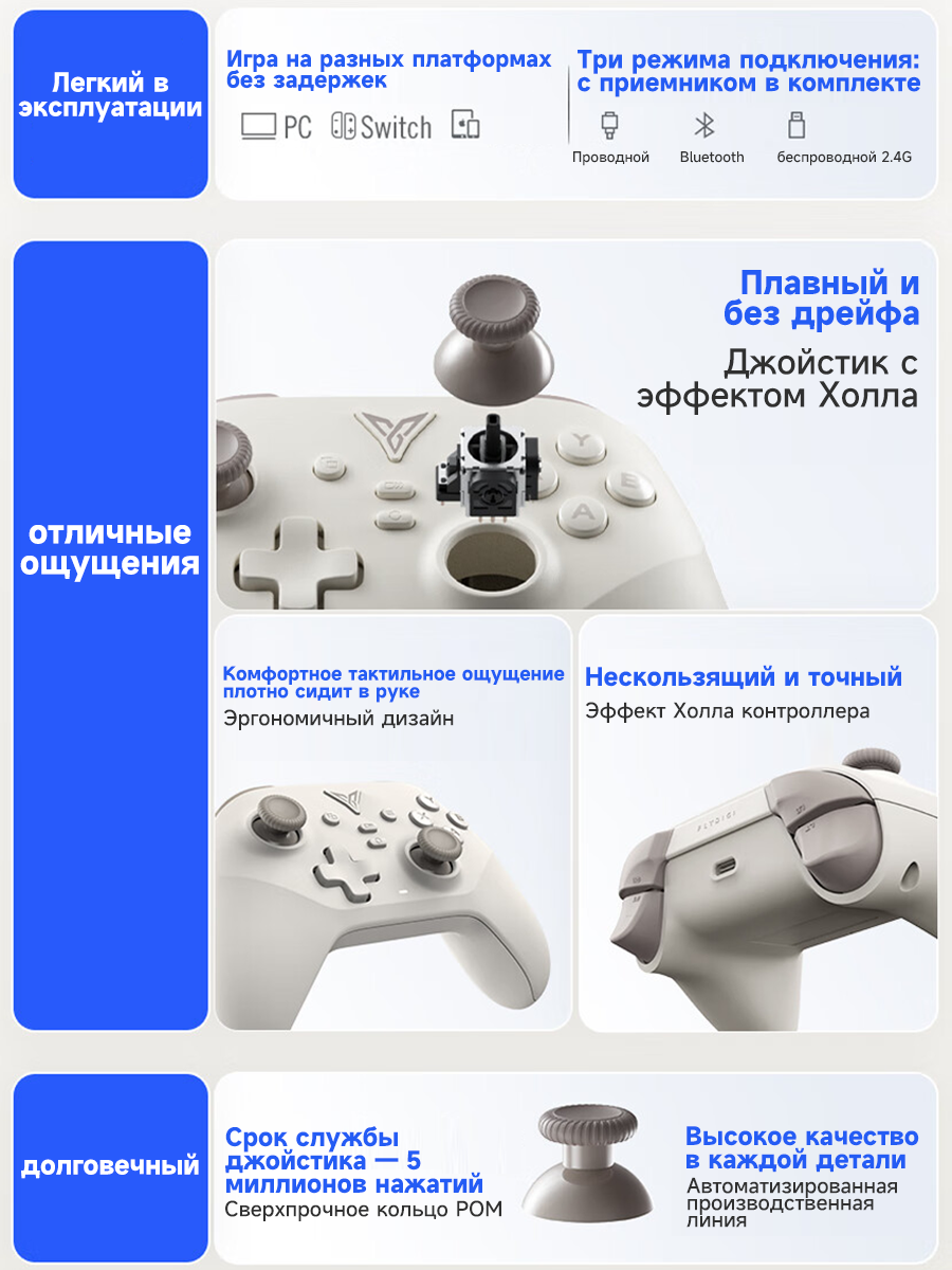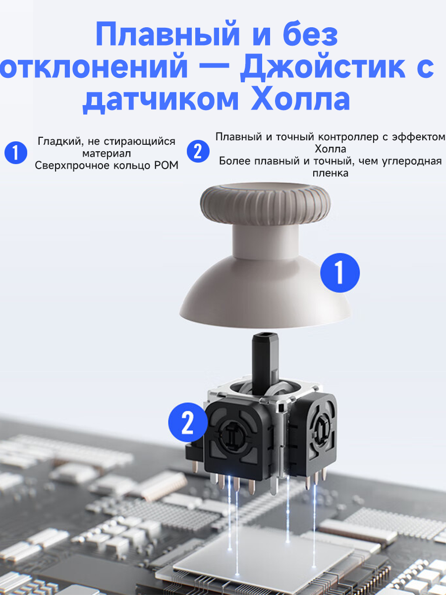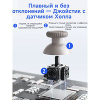 В нем используется коромысло Холла из материала POM со сроком службы до 5 миллионов раз (обычные коромысла рассчитаны только на 1 миллион раз) и оснащено технологией бесконтактного магнитного зондирования, обеспечивающей плавное управление без дрейфа. Триггер Холла поддерживает линейное нажатие, что позволяет точно контролировать глубину нажатия дроссельной заслонки в гоночных играх, таких как «Forza Motorsport». Клавиши ABXY имеют трехступенчатую механическую конструкцию с ходом клавиши 2,8 мм и усилием срабатывания 60 гс, что соответствует требованиям MOBA-игр и скоростной стрельбы в FPS.