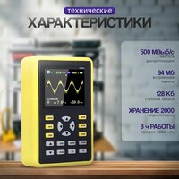Технические характеристики Модель: FNIRSI 5012H Питание: 3.7В литиевая батарея 3000мАч Контроллер: 32-разрядный Cortex-M4 Дисплей: 2.4 дюйма цветной TFT экран 320х240 точек с подсветкой Каналы осциллографа: 1 Входное напряжение: ±80В (щуп х1) ±800В (щуп х10) Входной импеданс: 1МОм Развязка входного сигнала: AC, DC Частота дискретизации: до 500 млн. выборок в секунду Полоса пропускания: 0 - 5МГц (щуп х1) 0 - 100 МГц (щуп х10) Глубина буфера захвата: 128КБ Время нарастания: менее 3нс Разрешение АЦП: 8бит Шкала развёртки Горизонтальная (времени): 6нс/деление - 50с/деление Вертикальная (напряжения): 50мВ/деление - 10В/деление Шаг перенастройки: 1-2-5 Точность измерения: ±2% вертикальная, ±0.01% горизонтальная Синхронизация развёртки: Auto (автоматический), Normal (нормальный), Single (однократный) Режимы запуска развёртки: по нарастающему / по спадающему фронту сигнала с настраиваемым порогом Автоматическое измерение: напряжение максимальное, минимальное, среднее напряжение среднеквадратичное (RMS) амплитуда (Vpp), напряжение в плюсовом диапазоне амплитуды (Vp) частота, рабочий цикл (в плюсовом и минусовом диапазонах) период импульса (общий, в плюсовом и минусовом диапазонах) Размер внутреннего хранилища: 64МБ Встроенные функции Автоподстройка параметров входящего сигнала Сохранение во внутренней памяти до 2000 осциллограмм с данными измерений Просмотр и удаление записанных осциллограмм Мультиуровневая буферизация 1-8 (технология послесвечения участков сигнала) Автокалибровка прибора Автоцентрование триггера развёртки (50%) Режим паузы для развёртки Интерфейсные разъёмы BNC: входной канал осциллографа Micro-USB 5В: для подзарядки батареи Корпус: чёрный АБС-пластик Температура эксплуатации: -10°С ~ +55°С Размеры: 114 х 74 х 33мм Вес: 250г