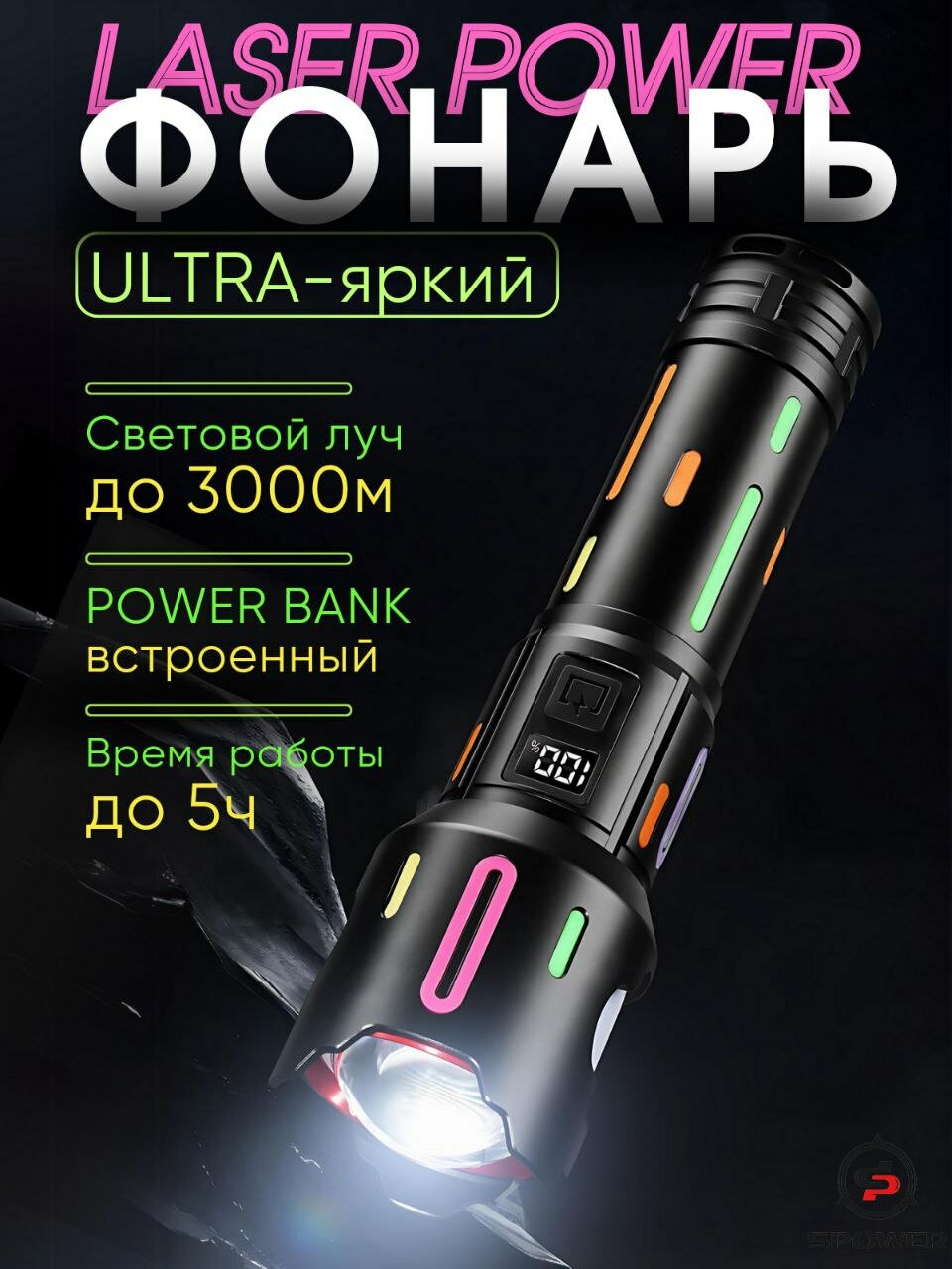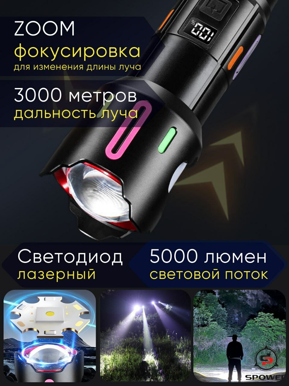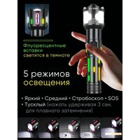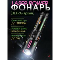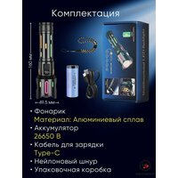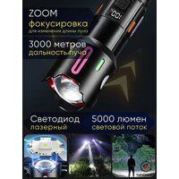 Мощный ультра яркий светодиодный фонарь c усиленным аккумулятором идеально подойдет для охоты, рыбалки, на даче или для освещения гаража, походов, кемпинга, дальних поездок, службе в армии, а так же для занятия альпинизмом и другими экстремальными видами спорта, а так же прогулок или работы в автосервисе. Имеет водостойкий алюминиевый корпус. Большой фонарь светильник походный дачный работает от аккумуляторов большой ёмкости (в комплекте). Узко-сфокусированный луч обеспечивает обзор до 3000 метров, что позволит использовать его и в труднопроходимых местах, таких как густые леса, узкие горные ущелья, болотные местности и разных погодных условиях, и в жару и в дождь, туман и снегопад. Дальнобойный лед фонарь работает от больших литий-ионных аккумуляторов, благодаря чему свечение на максимальном режиме составляет 5 часов. Аккумуляторы для диодного мини фонарика снабжены защитой от взрыва и устойчивы к холоду. Корпус фонарика устойчив к охлаждению и перегреву, имеет защиту от попадания пыли и влаги. Мощный тактический лид фонарь имеет оптический zoom и пять режимов свечения: яркий, средний, тусклый, стробоскоп, SOS, что дает возможность сконцентрировать луч на определенном предмете или сделать большой яркий обзор. Кроме того содержит в себе встроенный Power Bank, что делает его еще более незаменимым. Фонарь не только поможет сориентироваться на местности, не заблудиться, но и остаться на связи или наслаждаться любимой музыкой, так как позволит от своего аккумулятора еще и зарядить телефон, наушники, электронную книгу и т. д. А флуоресцентные вставки помогут не потерять гаджет в темноте и добавят ему дополнительный изыск. Портативный фонарик поместиться в походный рюкзак, багажник или даже карман, легкий и удобно лежит в руке. Походный портативный фонарь - это отличный подарок настоящему мужчине, другу и отцу! Автомобильный водонепроницаемый фонарь является многофункциональным, идеально подойдет для строительных, охотничьих и в дачных целях или как военный прожектор.