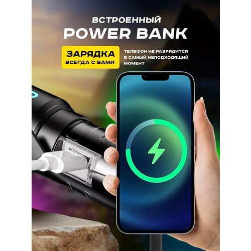 Сверх мощный аккумуляторный фонарь с флюоресцентными вставками на корпусе и вокруг светодиода, которые светятся в темноте. Оснащен сверхярким светодиодом PM30-TG, который выдает на высокую дальность идеально круглый четко сфокусированный луч света, похожий на лазер. Фокусировка меняется движением головной части. Имеет компактный ручной дизайн и выполнен из прочного алюминиевого корпуса. Противоскользящая текстура обеспечивает комфортное и надежное удержание в руке. Всего 5 режимов свечения от самого яркого до стробоскопа и режима SOS. Есть полноценный USB разъем, позволяющий светодиодному фонарику работать, как Powerbank, заряжая ваши мобильные устройства. Также есть удобный цифровой индикатор заряда. В комплекте удобный шнурок на руку, кабель зарядки Type-C и тестовый аккумулятор с типоразмером 26650 на первое время. Настоятельно рекомендуем приобрести более емкий АКБ для долговременной работы. Все порты закрываются резиновой заглушкой, что делает его влагозащищенным и позволяет использовать во время дождя или ненадолго уронить в воду. А за счет корпуса из авиационного алюминия, он достаточно ударопрочный, поэтому ронять его не так страшно. Данный ручной фонарь во время работы напоминает настоящий прожектор и будет отличным подарком как для мужчины, так и для женщины. Подходит для дома, дачи, рыбалки и поисковых работ.
