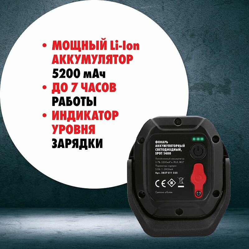 Мощный светодиодный переносной светильник для освещения рабочего места. Выполнен в прочном компактном корпусе с мощным магнитом в основании, с 4 уровнями светового потока от 350 до 1400 Лм. Тип: ручной. Тип аккумулятора: Li-Ion. Материал корпуса: алюминий, пластик. Емкость: 5.2 А*ч. Защита от влаги: да. Защита от удара: да. Взрывозащита: нет. Защита от перезаряда: нет. Источник света: светодиод. Цвет: черный/серый. Количество режимов работы: 4. Длина: 116 мм. Время работы: 2.5-7 ч. Элементы питания: встроенный аккумулятор. Количество и напряжение элементов питания: 1х3.7В. Количество аккумуляторов в комплекте: встроенный. Батарейки в комплекте: нет. Наличие разъема для зарядки: type-C. Степень защиты: IK07/IP65. Световой поток: 1400 Лм. Резьба под штатив: нет. Количество светодиодов/ламп: 1 шт. Наклонный механизм: да. Функция Zoom: нет. Класс товара: Профессиональный. Вес нетто: 0.43 кг. Габариты без упаковки: 116x101x41.5 мм. Индикатор уровня зарядки: да. Наличие магнита: да. Вспомогательный красный свет: нет. Датчик движения: нет. Сенсорное управление: нет. Комплектация: Фонарь карманный светодиодный LED SPOT1400, Зарядный кабель в комплекте.