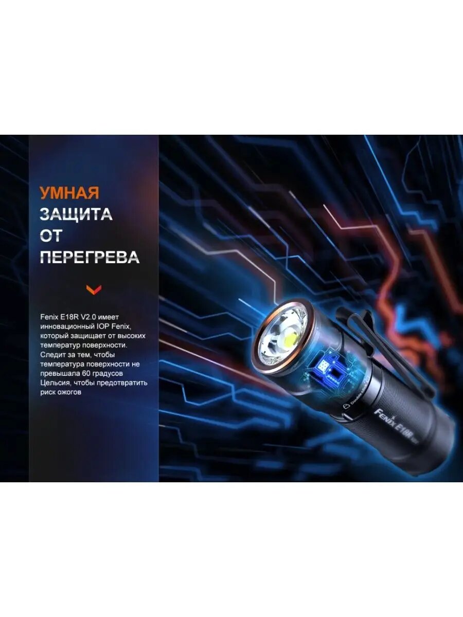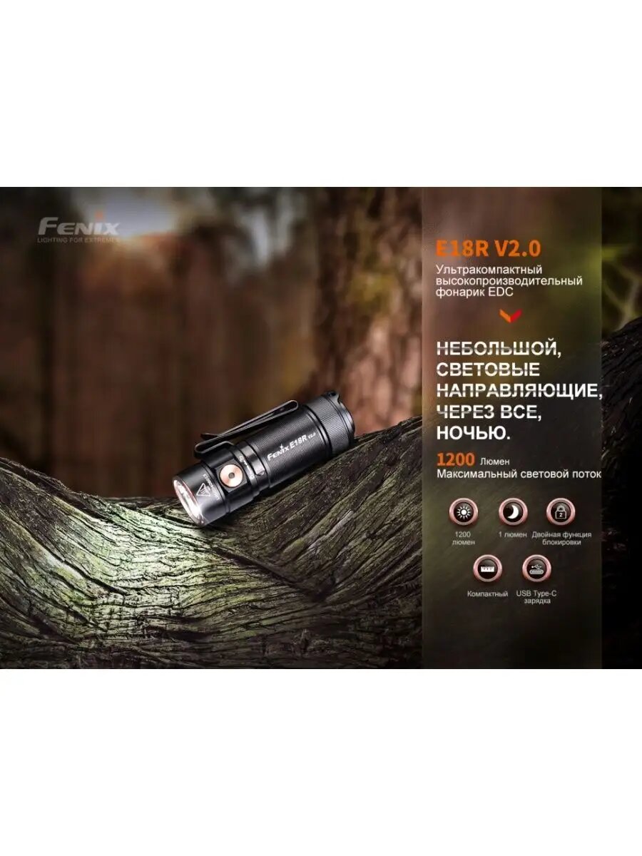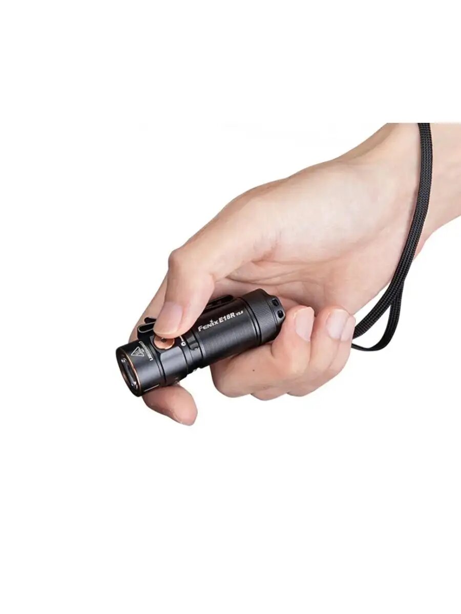 Аккумуляторный фонарь Fenix E18R V2.0 — это мощный прибор в ультракомпактном дизайне для повседневного ношения. Этот фонарь выдает максимум 1200 люменов с дальнобойностью луча 146 метров. Питание фонаря происходит от входящего в комплект литий-ионного аккумулятора ARB-L16-700P, полностью заряжается через зарядный порт USB Type-C. Удобный боковой переключатель активирует все режимы освещения и включает индикатор уровня заряда батареи, помогая вам всегда знать состояние заряженности.