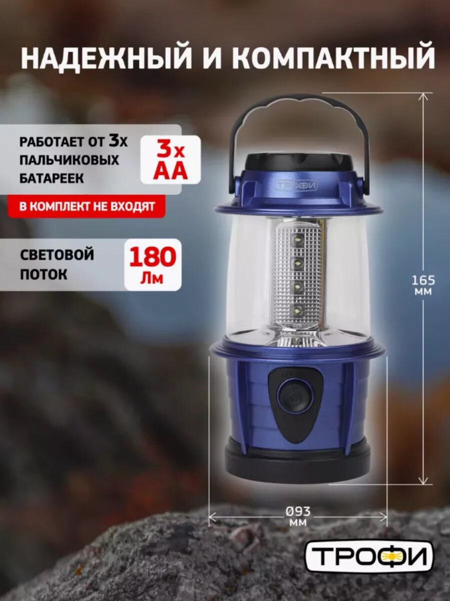 складной, крючок; высота от 130 мм до 188 мм; тип батарей: AA; подробная комплектация: Фонарь кемпинговый светодиодный - 1 шт.; количество батарей: 3; количество режимов работы: 1