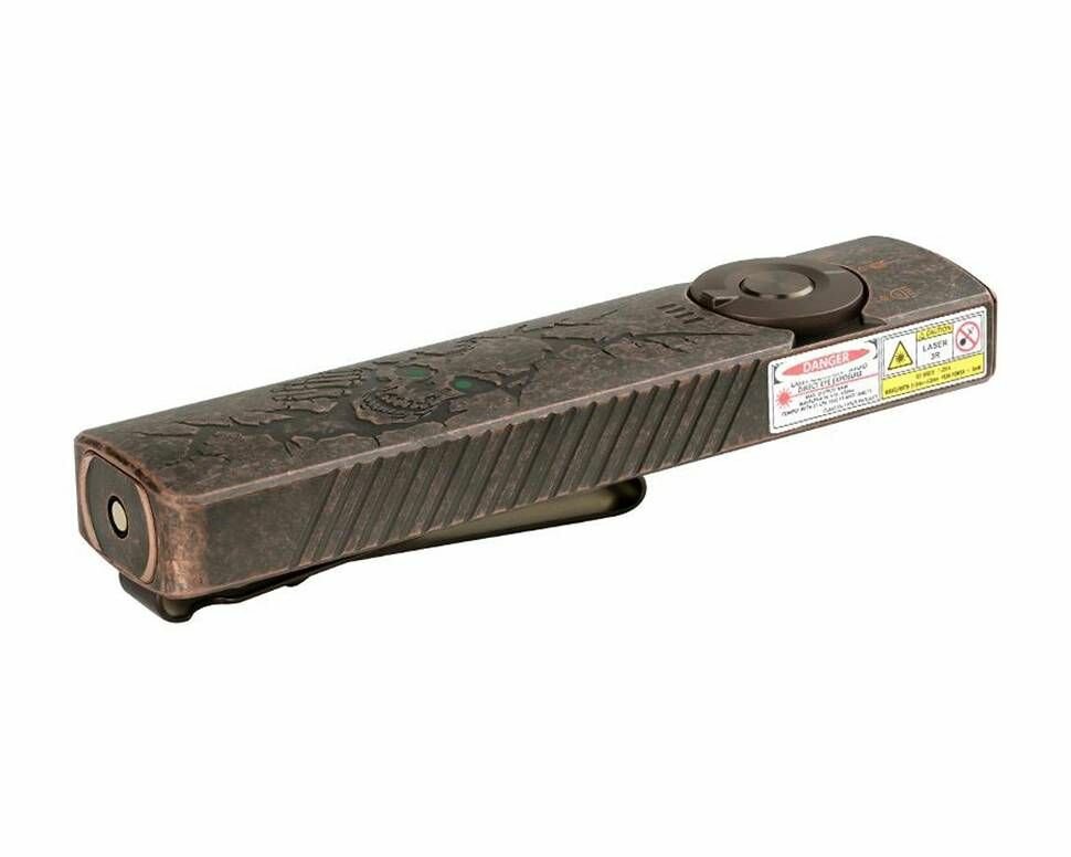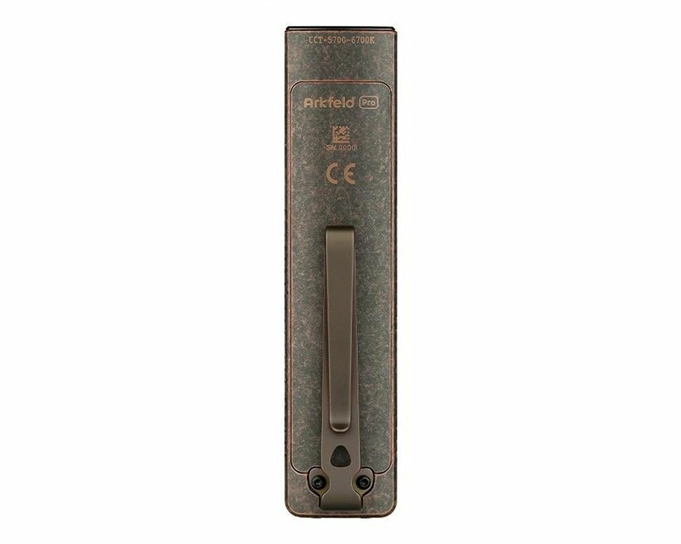 Ручной EDC фонарь Olight Arkfeld Pro Copper Bones Class 3R из медного сплава с дополнительным ультрафиолетовым светодиодом 365 nm мощностью 5 mW зеленым лазерным целеуказателем. Основной светодиод белого света Osram P9 мощностью светового потока 1300 люмен и дальностью 102 метра. Arkfeld Pro питается от встроенного li-po аккумулятора емкостью 1500 mAh, который заряжается магнитным кабелем Olight MCC от USB выхода.