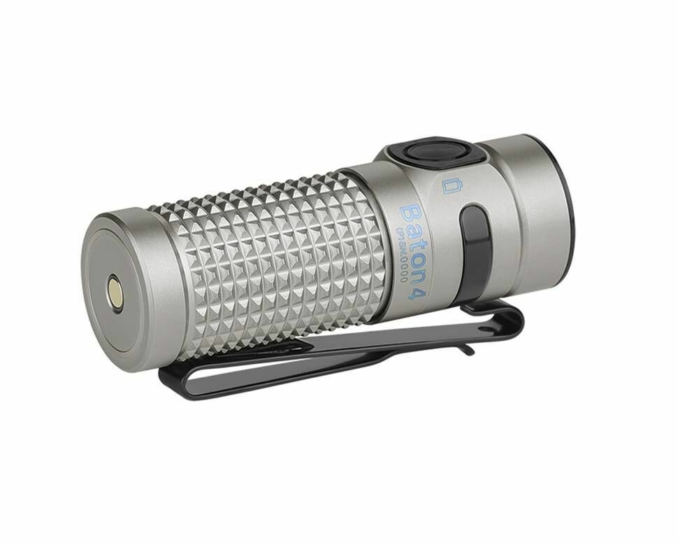Перезаряжаемый светодиодный фонарь Olight Baton 4 Premium Edition Titanium лимитированной серии от компании Олайт, поставляется c портативным беспроводным зарядным устройством-чехлом с зарядкой Type-C USB. Специально изготовленный зарядный чехол включает в себя встроенный Li-ion аккумулятор 21700 3,7 В. емкостью 5000 мАч, позволяющий полностью зарядить Baton 4 до 3,7 раза Фонарь использует светодиод диод Luminus SST-40, максимальная мощностью светового потока составляет 1300 люмен и дальностью 170 метров. Цветная индикация заряда аккумуляторной батареи оповестит вас о необходимости зарядить фонарь.