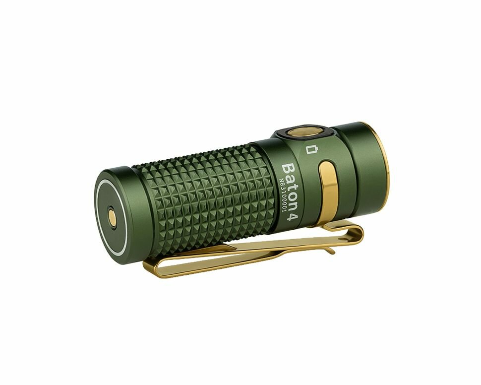 Перезаряжаемый светодиодный фонарь Olight Baton 4 OD Green от компании Олайт, поставляется с аккумулятором IMR16340 и с переносным магнитным USB кабелем Olight MMC3 для подзарядки фонаря о USB. Фонарь использует светодиод диод Luminus SST-40, максимальная мощностью светового потока составляет 1300 люмен и дальностью 170 метров. Цветная индикация заряда аккумуляторной батареи оповестит вас о необходимости зарядить фонарь.