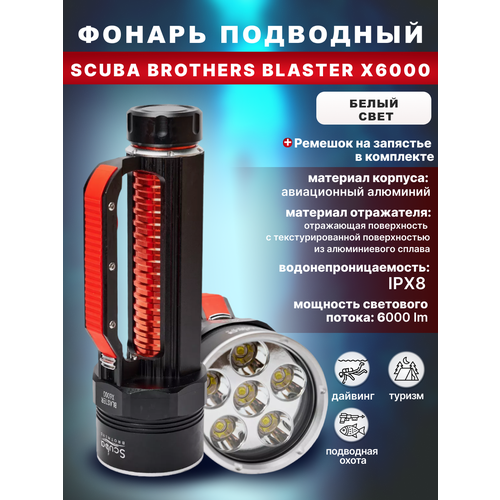 Фонарь подводный SCUBA BROTHERS BLASTER X6000, 6000 lm, белый свет, это подводный фонарь c шестью диодами XHP70.2 (второе поколение) для охоты и дайвинга, который изготовлен из высокопрочного авиационного алюминия с анодированием.