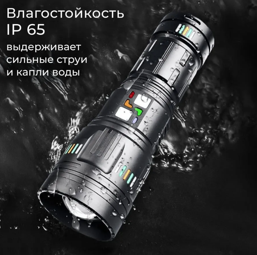 | особенности | влагозащита, встроенный power bank, дальний свет, дневной белый свет, индикация заряда, маячок, мигание, регулировка угла свечения, ударопрочный корпус, холодный белый свет |