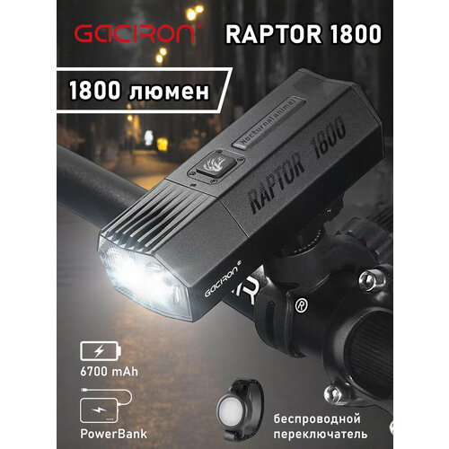 Gaciron Raptor 1800 — сверхъяркий передний велосипедный фонарь мощностью 1800 люмен. Он оснащен аккумулятором большой ёмкости 6700 мАч и может также использоваться в качестве мобильного аккумулятора (пауэр банка). Беспроводной пульт дистанционного управления позволяет регулировать яркость и режим во время катания, а также легко переключаться между дальним и ближним светом. Фонарь имеет степень водонепроницаемости IPX6 и может выдерживать любые погодные условия.