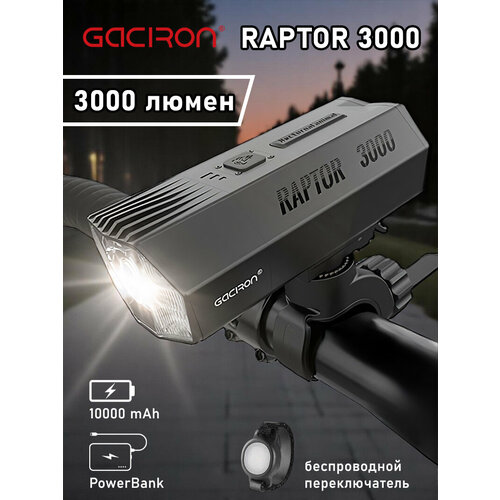 Gaciron Raptor 3000 — передний велосипедный фонарь, который может похвастаться сверхвысокой яркостью до 3000 люмен. Он оснащен аккумулятором большой ёмкости 10000 мАч и может также использоваться в качестве мобильного аккумулятора (пауэр банка). Беспроводной пульт дистанционного управления позволяет регулировать яркость и режим во время катания, а также легко переключаться между дальним и ближним светом. Фонарь имеет степень водонепроницаемости IPX6 и может выдерживать любые погодные условия.
