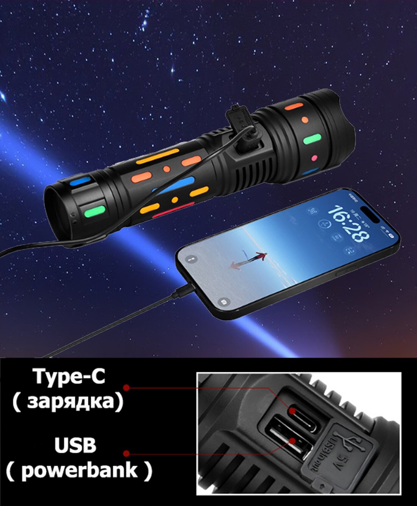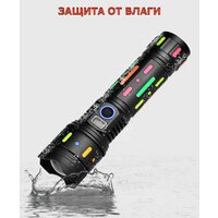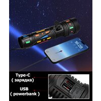 Сверхмощный светодиодный лазерный фонарь на 40000 Люмен с возможностью регулировки пучка света и 4 режимами свечения: яркий, средний, экономичный и SOS. На максимальном режиме, узко-сфокусированный луч может обеспечить обзор до 5000 метров, светодиод PM60-TG. Дальнобойный фонарь работает от аккумулятора XQ 32850A 4.2v 10000 mAh, благодаря чему свечение на максимальном режиме составляет 3-5 часов. Аккумулятор снабжен защитой от взрыва и устойчивы к холоду. Дополнительно способствует стабильной работе фонаря, корпус из анодированного алюминия, который устойчив к охлаждению и перегреву. Прочный, но легкий корпус защищает от падений и попадания пыли-влаги. Водонепроницаемость IPX-6, допускает использование в дождливую погоду. Кроме того, переносной фонарь имеет функцию Power Bank, которая позволяет заряжать другие устройства, например, мобильные телефоны, планшеты и т. д. У фонаря есть две кнопки включения. Одна включает и отключает только режим яркого свечения, другая включает и переключает режимы. Фонарь профессиональный очень компактный, карманный можно хранить в бардачке автомобиля ( автомобильный фонарь) или гараже, дома. Отлично подойдет для активного отдыха спорта кемпинга чтения, ремонтных работ и любого типа освещения в труднодоступных местах, автосервиса, даже в качестве фары - где особенно важно, чтобы ваши руки оставались свободными. Снаряжение для походов и туризма можно использовать в качестве освещения в палатке как подвесной светильник. Рядом с кнопками включения находится индикатор, сообщающий заряд батареи фонарика. Отличный подарок! Подойдет для туризма, рыбалки, охоты.