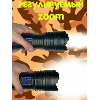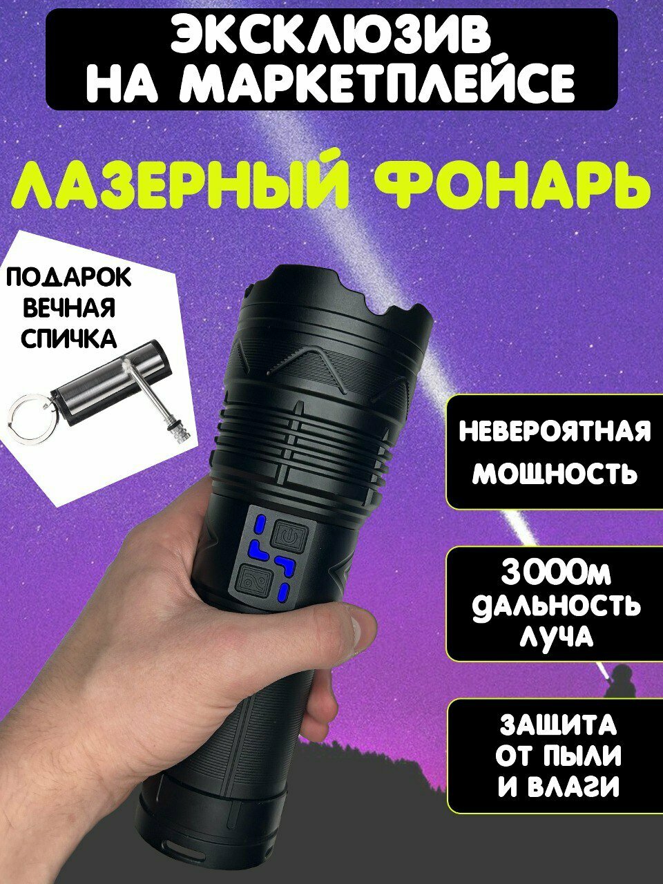 Фонарик лазерный аккумуляторный ручной 5000 короткий. Сверхмощный светодиодный лазерный фонарь на 40000 Люмен с возможностью регулировки пучка света и 4 режимами свечения: яркий, средний, экономичный и SOS. На максимальном режиме, узко-сфокусированный луч может обеспечить обзор до 5000 метров, светодиод PM60-TG. Дальнобойный фонарь работает от 4-х аккумуляторов 18650А (3800 mAh), благодаря чему свечение на максимальном режиме составляет 3-6 часов. Аккумулятор снабжен защитой от взрыва и устойчивы к холоду. Дополнительно способствует стабильной работе фонаря, корпус из анодированного алюминия, который устойчив к охлаждению и перегреву. Прочный, но легкий корпус защищает от падений и попадания пыли-влаги. Водонепроницаемость IPX-6, допускает использование в дождливую погоду. Кроме того, переносной фонарь имеет функцию Power Bank, которая позволяет заряжать другие устройства, например, мобильные телефоны, планшеты и т. д.