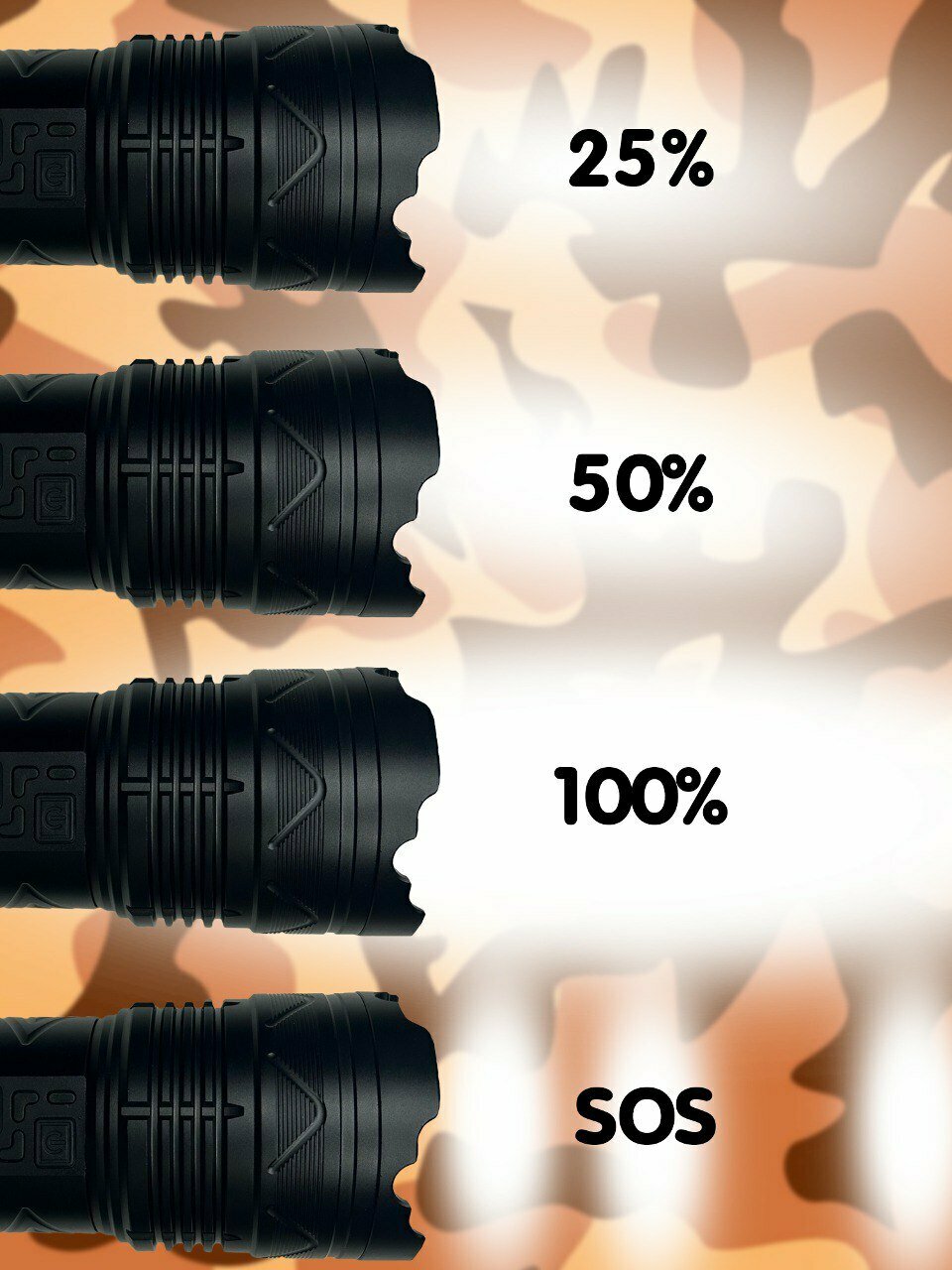 Сверхмощный светодиодный лазерный фонарь на 55000 Люмен с возможностью регулировки пучка света и 4 режимами свечения: яркий, средний, экономичный и SOS. На максимальном режиме, узко-сфокусированный луч может обеспечить обзор до 3000 метров, светодиод PM40-TG. Дальнобойный фонарь работает от 4-х аккумуляторов 18650 (8800 mAh), благодаря чему свечение на максимальном режиме составляет 3-6 часов. Аккумулятор снабжен защитой от взрыва и устойчивы к холоду. Дополнительно способствует стабильной работе фонаря, корпус из анодированного алюминия, который устойчив к охлаждению и перегреву. Прочный, но легкий корпус защищает от падений и попадания пыли-влаги. Водонепроницаемость IPX-6, допускает использование в дождливую погоду. У фонаря есть две кнопки включения. Одна включает и отключает только режим яркого свечения, другая включает и переключает режимы. Рядом с кнопками включения находится индикатор, сообщающий заряд батареи фонарика. Отличный подарок! Подойдет для туризма, рыбалки, охоты.