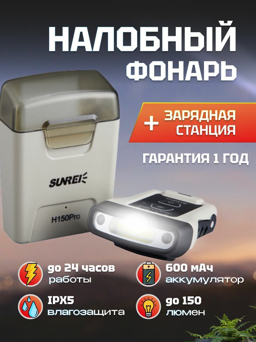 Фонарик налобный аккумуляторный с зарядной станцией Sunree H150 Pro Sensor Hat Light 150 лм, с сенсором, 600мАч + 730мАч (кейс), IPX5, 6500K: сравнение цен, характеристики, фото, актуальное наличие и цены.