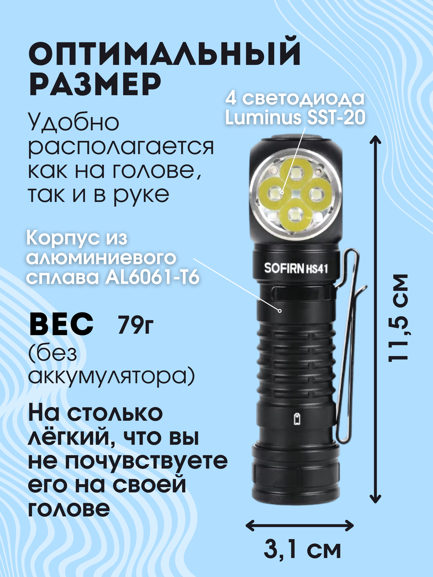 Sofirn HS41 — это мощный налобный фонарь, который сочетает в себе функциональность и высокое качество.