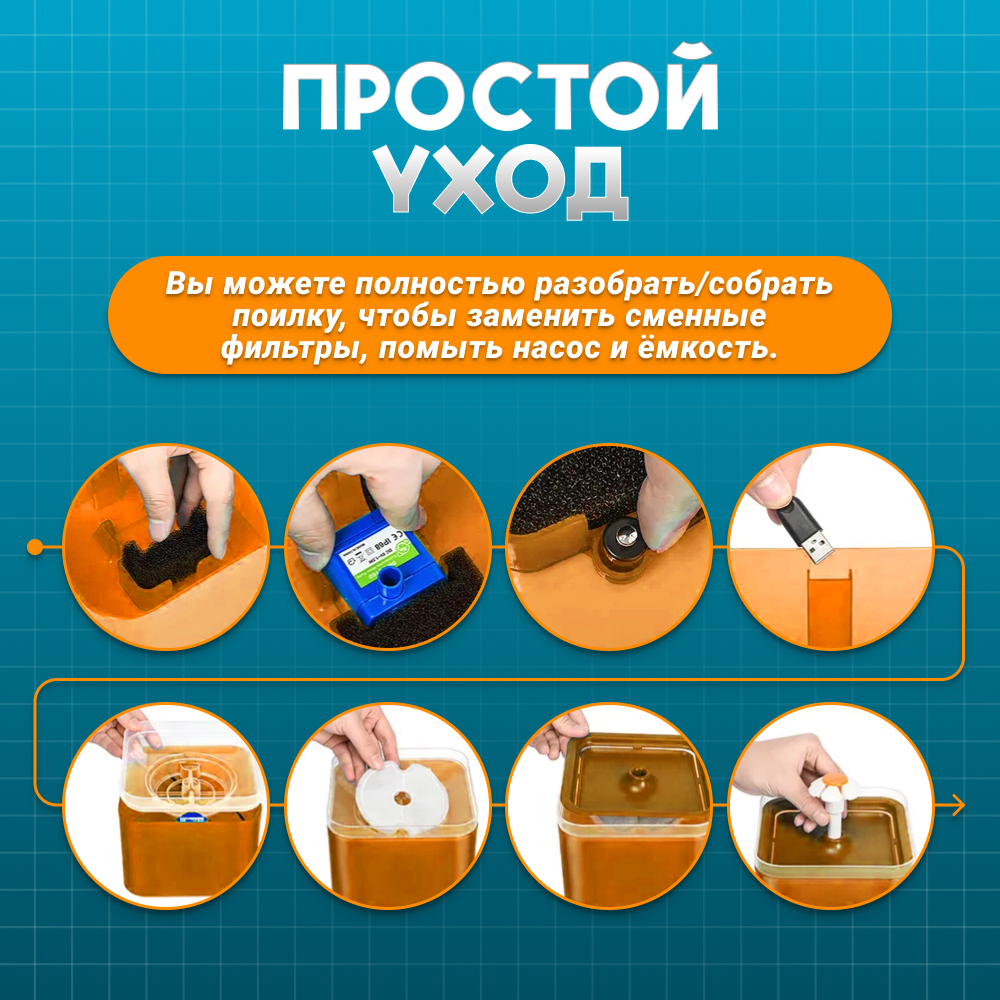 Система использует сменный круглый фильтр для очистки воды, удаления грязи и пищевых частиц . Круглый фильтр состоит из слоев хлопка, активированного угля, кокосовой скорлупы и ионообменных смол. Он обеспечивает свежую чистую воду для ваших питомцев. Губчатый фильтр на водяном насосе будет улавливать волосы и мусор, что обеспечивает правильную работу насоса. Сменный круглый фильтр, губчатый фильтр и водяной насос. Насос съемный и моющийся.