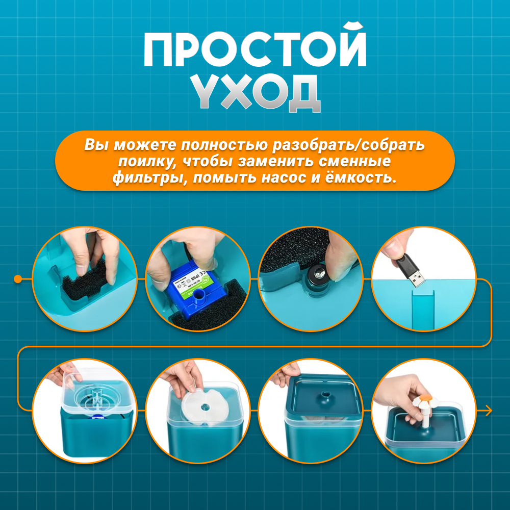 корпус, фильтр, насос с USB, адаптер (блок питания). Объем поилки 2 литра, длина кабеля 1,75 м.