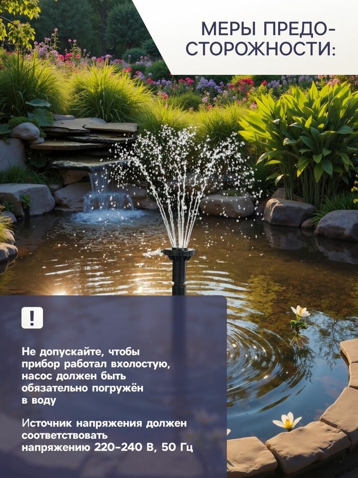 Фонтан HJ-943 является идеальным решением для тех, кто хочет добавить стильный элемент в свой сад, а также создать атмосферу спокойствия. Удобное питание от сети обеспечивает его надежную работу, а шнур длиной 4.9 метра удобно размещает фонтан в нужной части вашего водоёма.