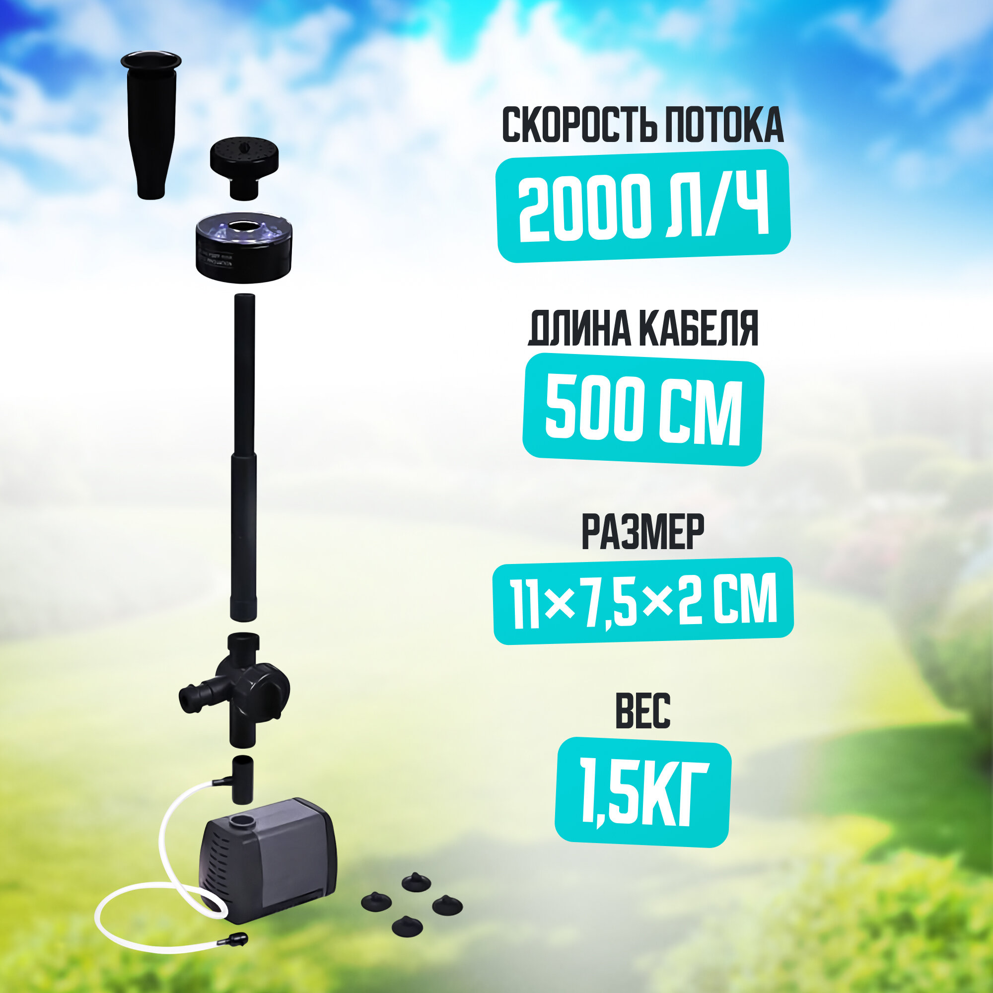 Насосное оборудование для бассейна оснащено электродвигателем переменного тока и питается от бытовой сети напряжением 220/230 В. Фонтан салют с насосом может эффективно использоваться не только в условиях открытого воздуха на даче, но и устанавливаться в аквапарках, банях, саунах, общественных местах (парки, скверы, дворовые территории). Светящийся дачный фонтан в комплекте поставки предусматривает наличие одного светильника LED, две насадки и руководство по сбору и эксплуатации.