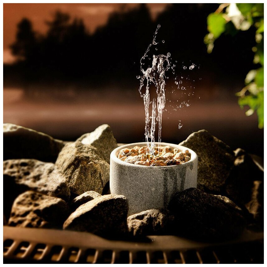 Фонтанчик достаточно разместить среди камней на банной печи, наполнить его водой с добавлением незначительного количества масла или специальным банным ароматизатором, и вы получите комфортный уровень влажности в парилке и приятную атмосферу для отдыха.