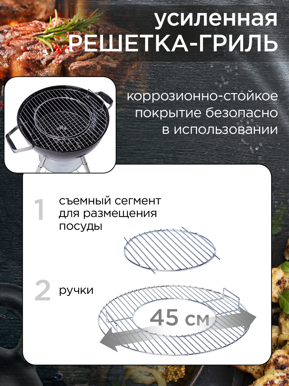 • решетка-гриль с коррозионностойким покрытием имеет съемный сегмент для размещения посуды;