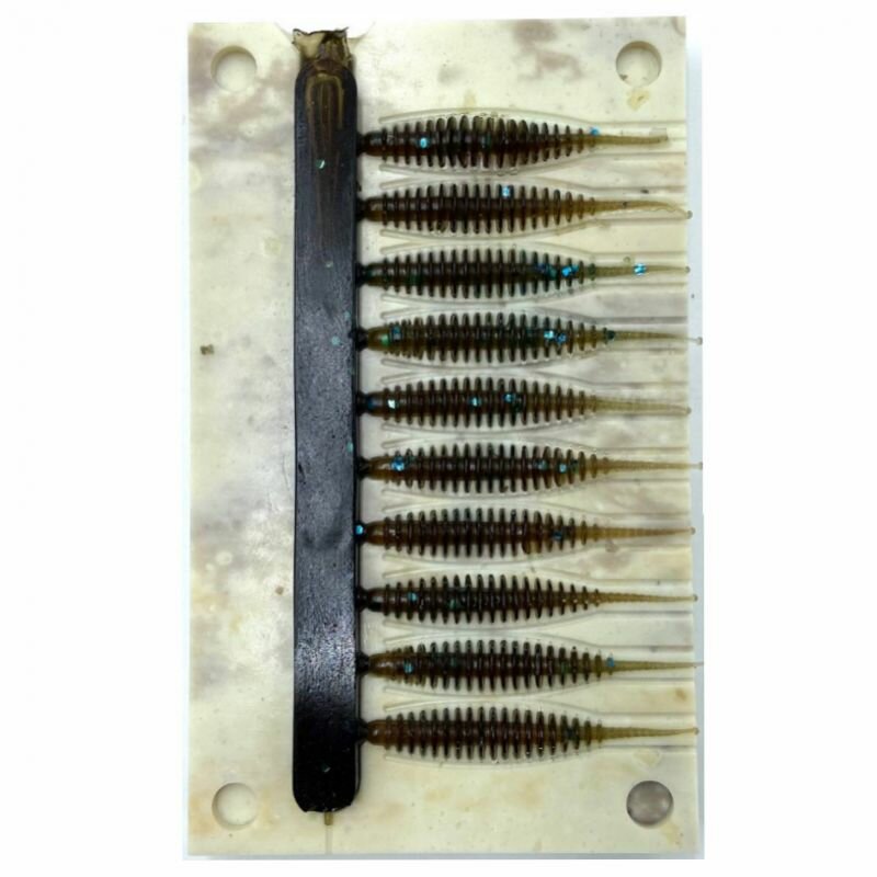 Материал формы: акриловый камень Рекомендованные параметры для качественного изготовления приманки Температура пластизоли: 135-145 градусов Твердость: 9,12 ШорА Способ подачи материала: снизу вверх Скорость подачи материала: медленно Дожим в конце: 5 секунд, без увеличения силы давления Смазка для формы: термостойкость более 200 градусов После каждой проливки необходимо прочистить воздуховоды в хвосте