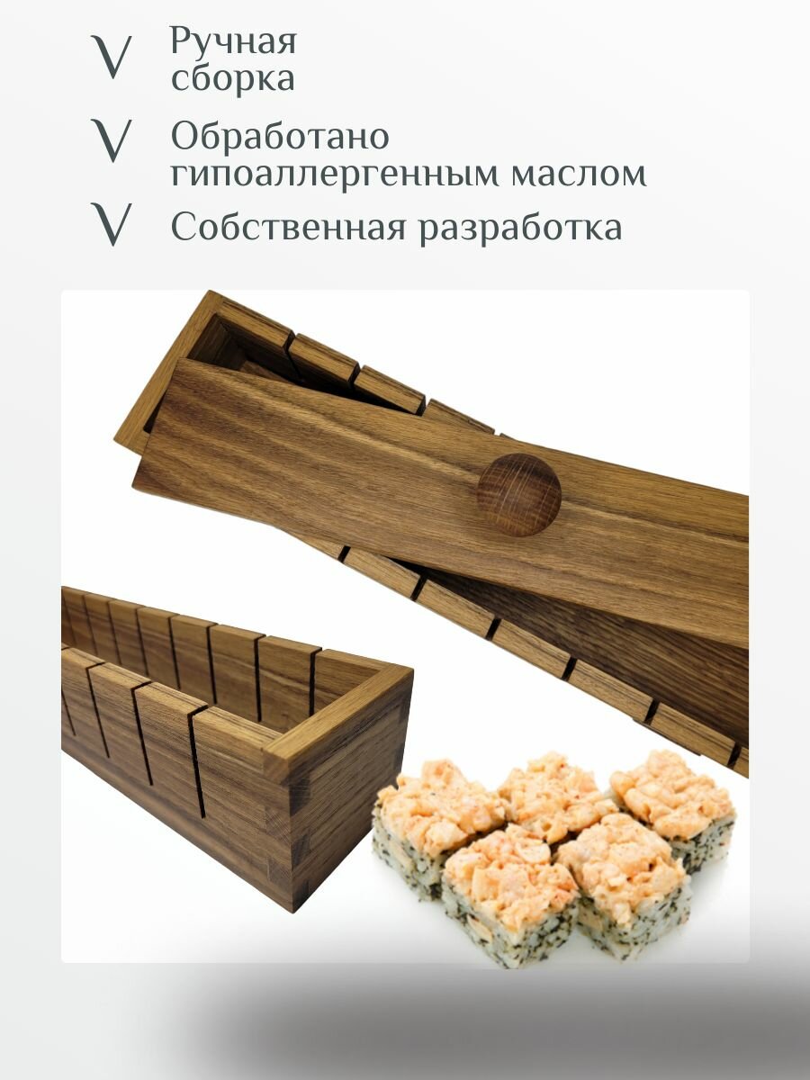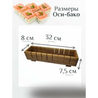 У любого суши-мастера в арсенале кухонных прибамбасов просто обязан быть такой ящичек. Это давильный ящик - оси-бако. С его помощью делаю прессованные суши - оси-дзуси или суши-кейки. Пользоваться им очень легко, достаточно подготовить продукты для суши и рис и, уложив их слоями, спрессовать их между собою. Получившуюся заготовку нарезать на 5-6 частей и уложить на блюдо. Для любителей ролл и суши - кухонный набор для приготовления роллов и суши, комплект из натурального дерева ценной породы - дуб. Изделия изготовленные из древесины дуба, отличаются оригинальной структурой и относятся к премиальному сегменту. Деревянный давильный пресс- ящик, утварь, устройство именуемый оси-бако (осибако), незаменим для приготовления формовочных суши, пищи, помощник любому сушисту. Содержит в себе принадлежности, приборы - гнетная крышка, рама и дно, подставка. Осидзуси, также называемый Оси Суши, является старейшей формой суши в Японии. Это прессованные японские суши, которые изначально состоят из трех слоев, двух слоев риса и слоя рыбы между ними в состав, которого входят разные вкусные ингредиенты (мясо, копченая рыба, овощи, огурец, авокадо). Размеры: длина наружняя 32 см, ширина 8 см, высота без подставки 6,5 см