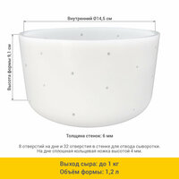 Форма имеет 8 отверстий на дне и 32 отверстия в стенке для отвода сыворотки. Большое количество отверстий обеспечивает лучший отвод сыворотки. На дне сплошная кольцевая ножка высотой 4 мм. Вмещает до 1,2 л сгустка.