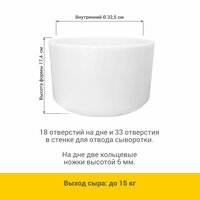 Формы с выходом сыра от 10-15 кг 18 отверстий на дне и 33 отверстия в стенке для отвода сыворотки. Большое количество отверстий обеспечивает лучший отвод сыворотки.