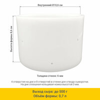 Форма имеет 4 отверстия на дне и 8 отверстий в стенке для отвода сыворотки. На дне сплошная кольцевая ножка высотой 3 мм.