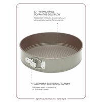 Форма для выпечки Полетта, разъемная, размер 28 на 6,6 см. Изготовленная из прочного и высококачественного материала, металлическая разъемная форма обладает отличной прочностью и долговечностью. Она не деформируется под воздействием высоких температур, что позволяет безопасно использовать ее в духовке до 230 градусов. Благодаря антипригарному покрытию GOLDFLON, выпечка легко отделяется от стенок блюда, что облегчает процесс извлечения готового изделия.