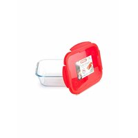 универсальная утварь Изделие выполнено из прочного боросиликатного стекла, которое не боится как высоких, так и низких температур (от -40 до 300 градусов). Это позволяет использовать ёмкость не только для запекания продуктов в духовом шкафу или в микроволновой печи, но и для хранения готовых блюд в холодильнике и морозильной камере.