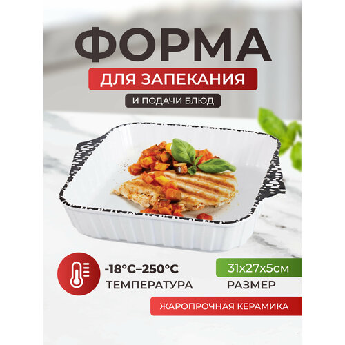 Для вкусной еды важен не только рецепт, но и то, в чем они готовятся. Квадратная форма для запекания Fresco Еlegance станет прекрасным решением для приготовления аппетитных шедевров! Жаропрочная керамика обеспечивает равномерное нагревание содержимого и сохраняет естественный вкус и аромат продуктов. Эстетичный внешний вид формы подходит для сервировки стола и подачи блюд. По бокам блюда имеются ручки, благодаря чему его очень удобно переносить и доставать из духового шкафа. Красивая посуда отличный подарок на любой праздник, день рождение или новоселье, особенно для женщин, для себя и своих родных. Размер: 31x27x5 см. Цвет: белый и черный.