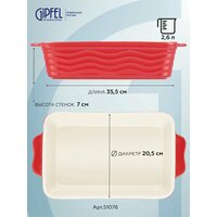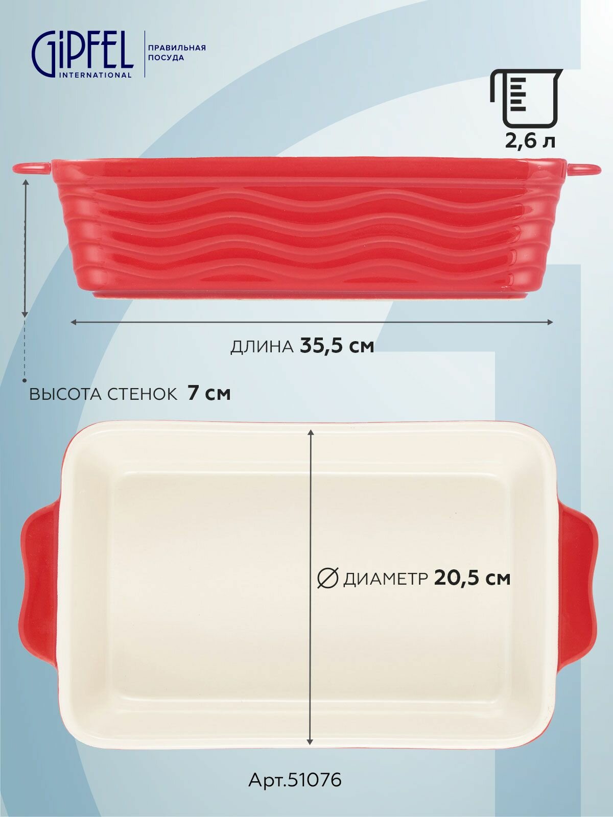 Форма для запекания GIPFEL ROSSO 51076. Прямоугольная форма из жаропрочной керамики имеет объем 2600 мл. Размер формы 35,5х21х6,8 см. Для удобства переноски по бокам сделаны ручки. Форма снаружи красного цвета и имеет фактурный рисунок в виде волн. Внутренний размер формы 29х19,5 см.