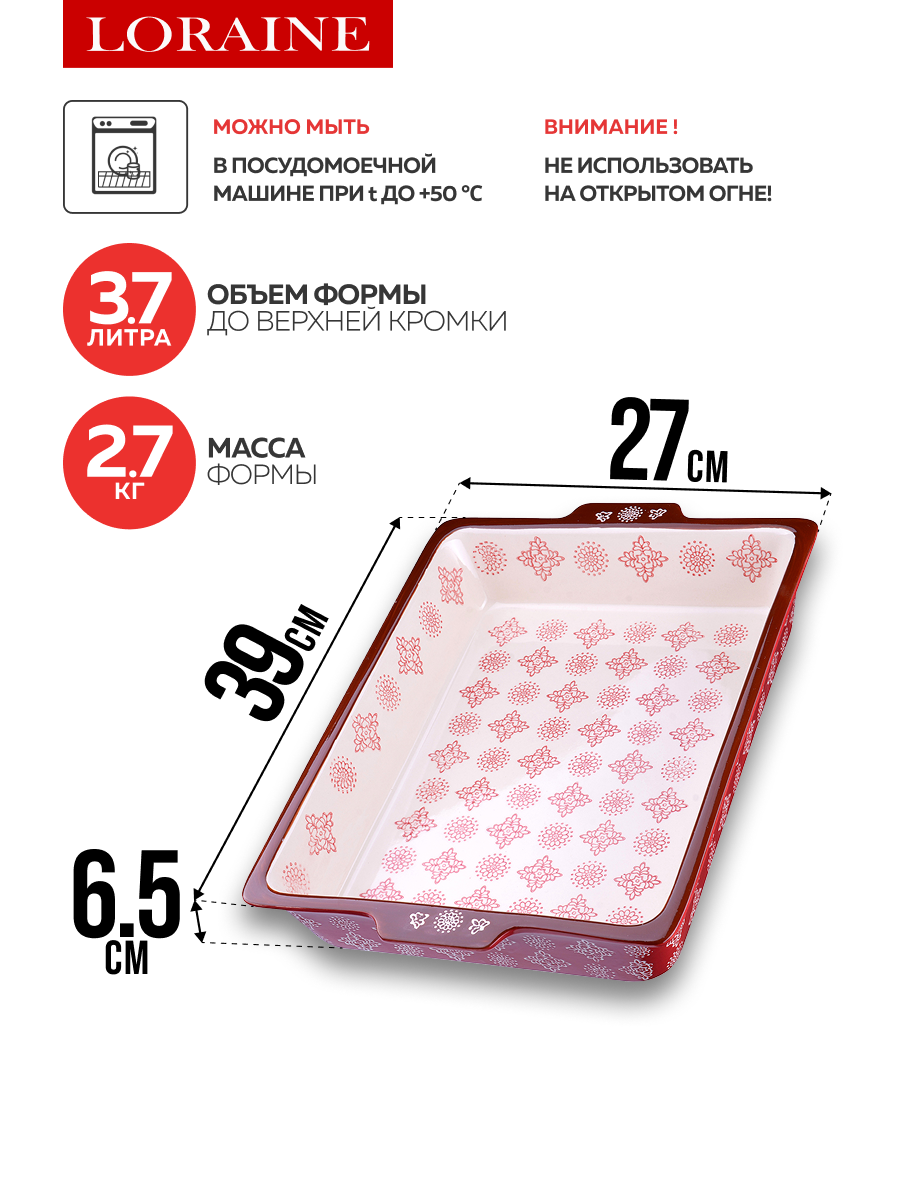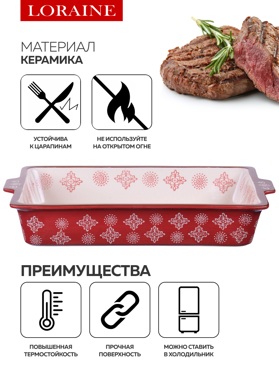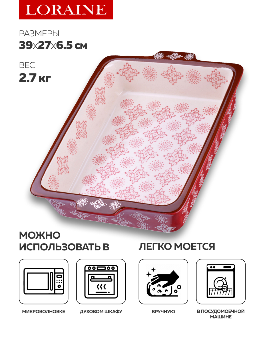 Форма для запекания Loraine 27929, керамика, прямоугольная, красная, 39.5x27x6.5 см: сравнение цен, характеристики, фото, актуальное наличие и цены.