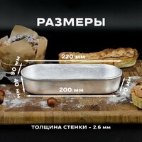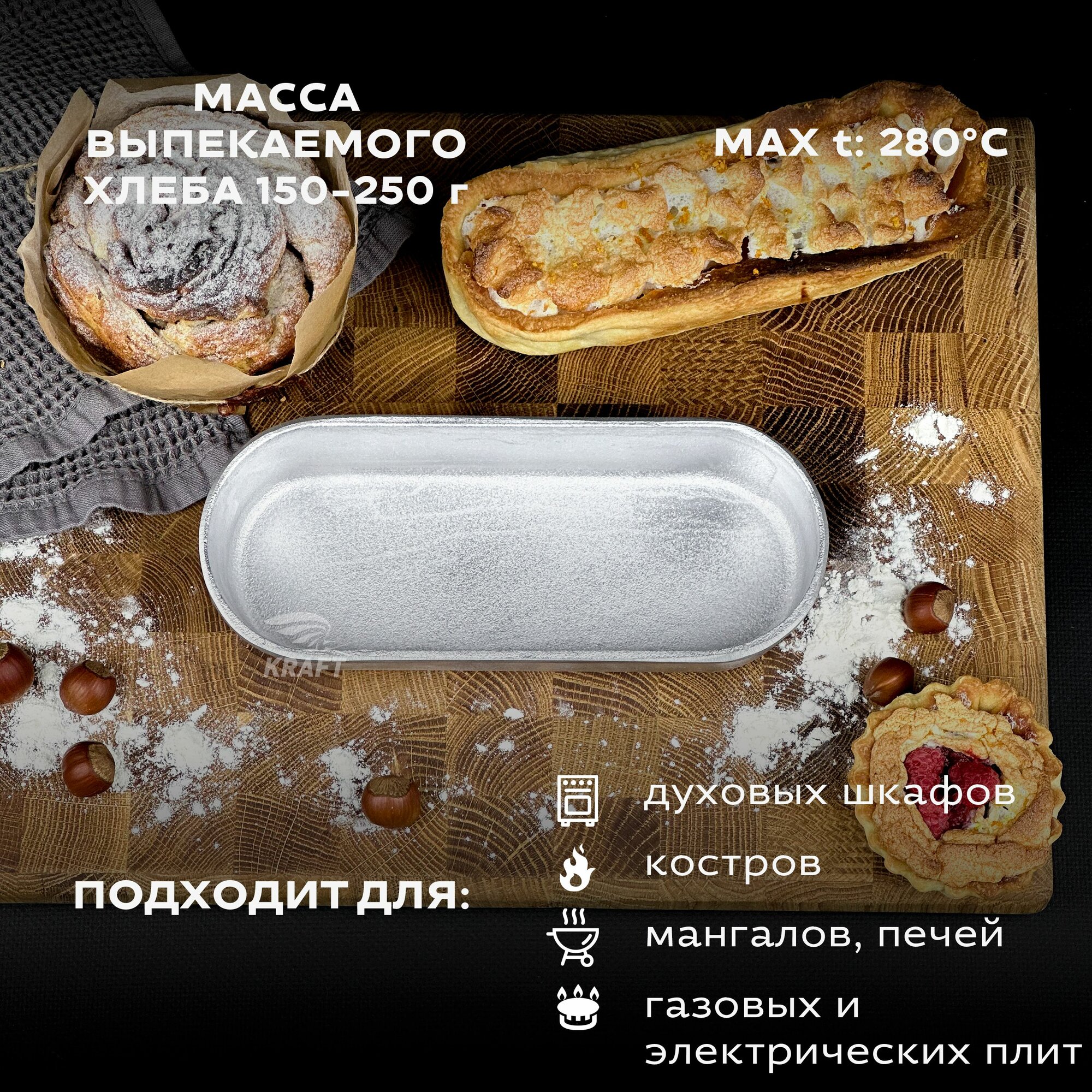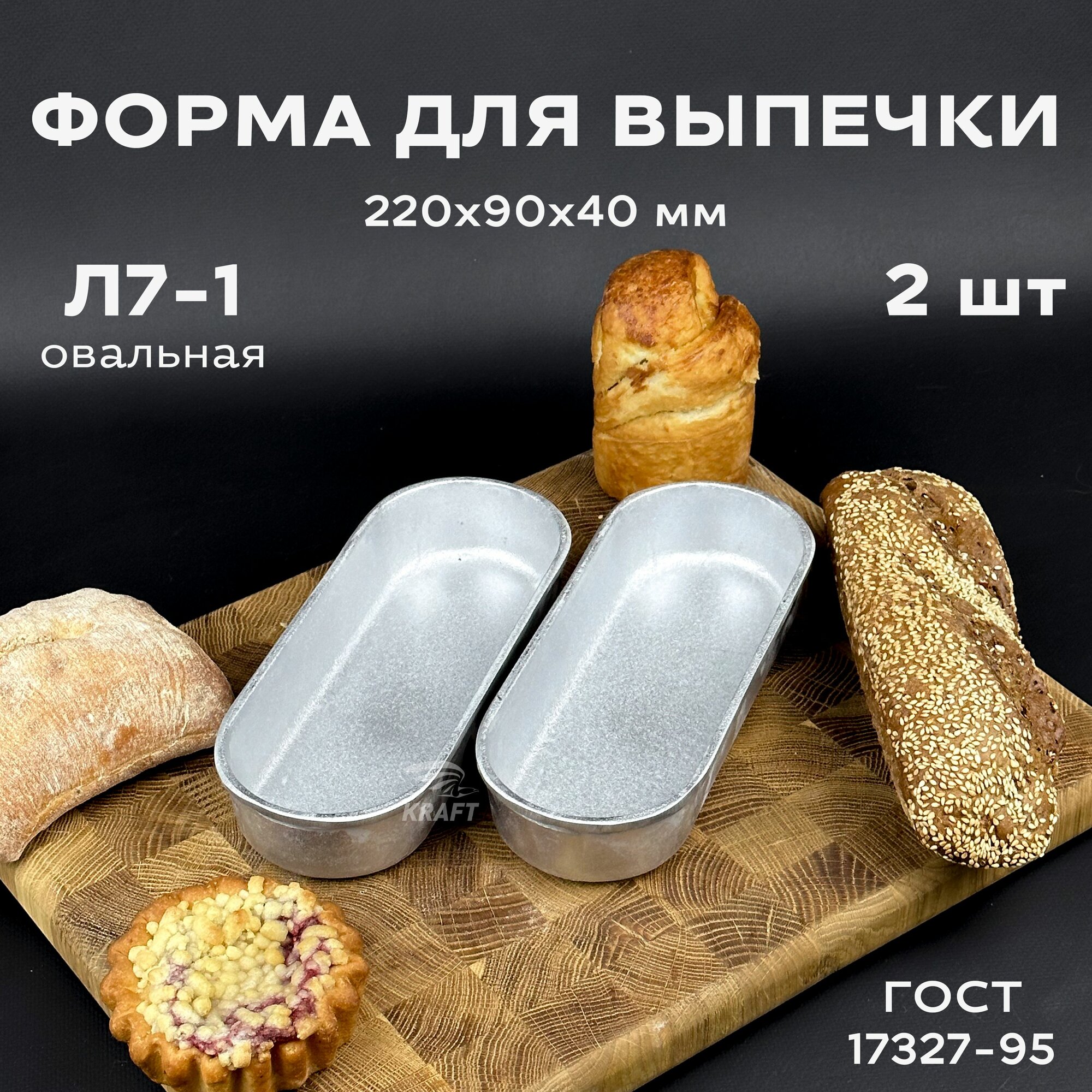 Комплект форм для хлеба алюминиевых 2 штуки Л 7-1 овальная, размер 220х90х40 мм, масса выпекаемого хлеба 150-250 гр. Форма изготовлена в соответствии с ГОСТ 17327-95 " Формы хлебопекарные . Технические условия". Форма заводская, может иметь шершавые края, что никак не влияет на качество хлеба. Шершавые края в процессе эксплуатирования нивелируются, либо их можно с легкостью сгладить наждачной бумагой. Перед первым использованием форму для хлеба необходимо прокалить с масляным слоем на внутренней поверхности, инструкция для первого использования в фотографиях. Алюминиевые формы для хлеба известны своей практичностью, ведь алюминий обладает высокой коррозийной устойчивостью и такая форма для выпечки хлеба прослужит не одно десятилетие. А за счет того, что хлебопекарная форма из алюминия имеет свойство быстрого и равномерного нагрева, корочка хлеба получается толстой и хорошо пропеченной, именно такую корочку, мы ели в детстве, возвращаясь из хлебного. Подходит для выпечки как в газовой духовке, так и в электрической печи, или печи на дровах. Прямоугольная форма для выпечки образует красивые, ровные буханки пшеничного, ржаного хлеба. Используйте собственную рецептуру, добавляя в хлеб семечки, злаки, сухофрукты. Форма для хлеба. Алюминиевая, литая форма для выпечки хлеба Л 7-1 долговечна и сохраняет форму буханки, проста и понятна в использовании, подходит для производства хлебобулочных изделий и для домашнего пользования.