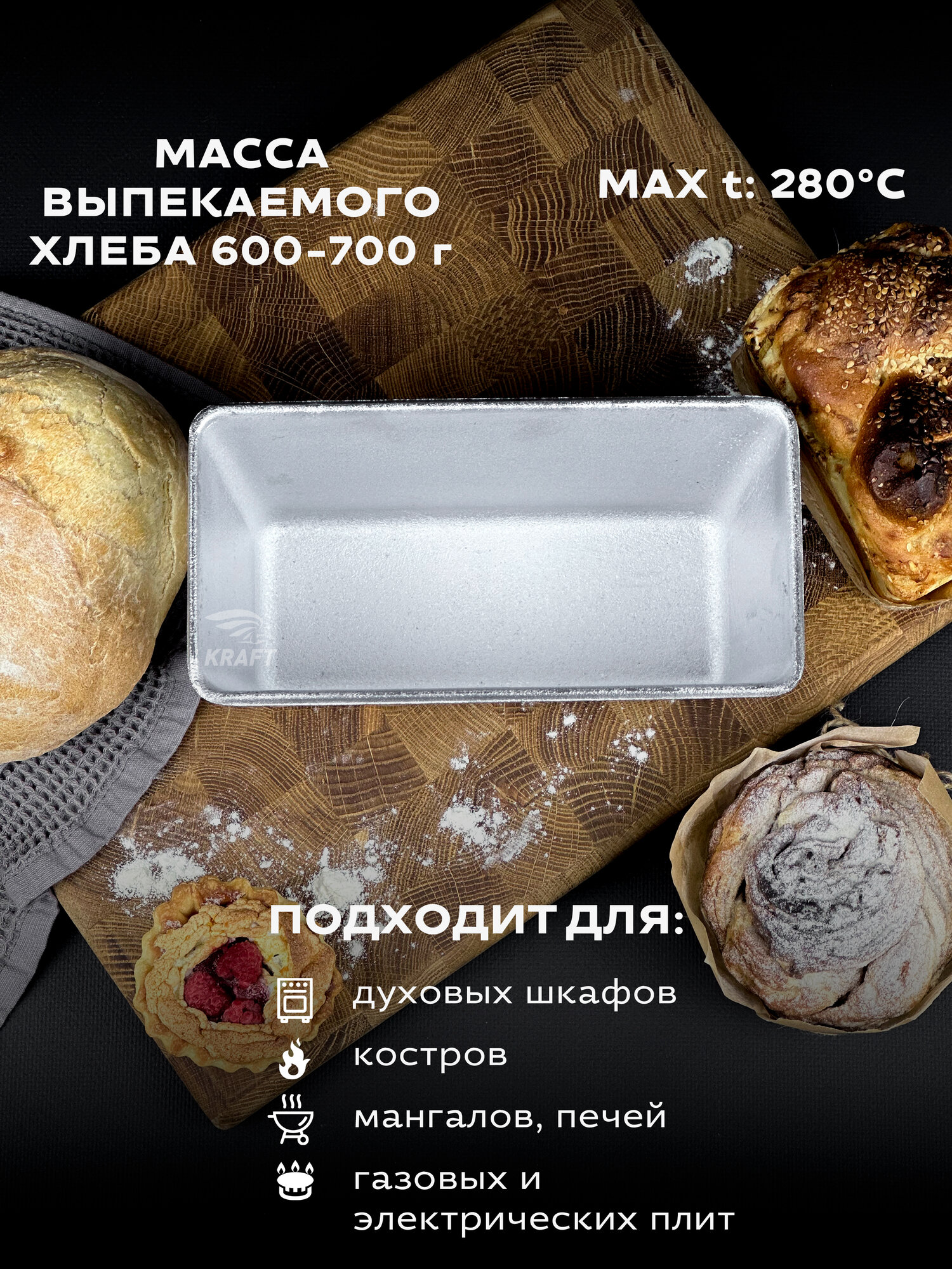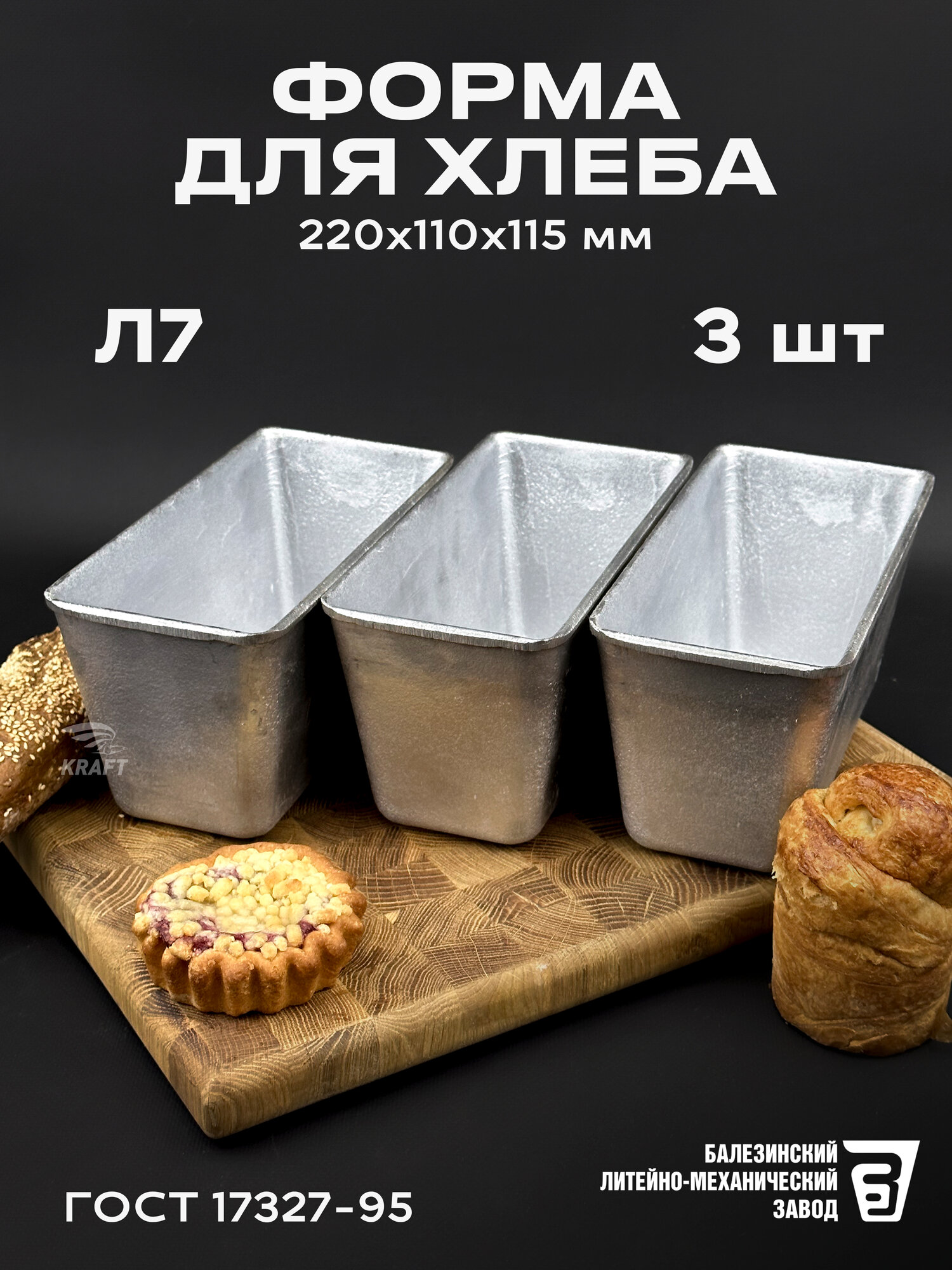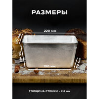 Комплект форм для хлеба алюминиевых Л7 3 штуки, размер 220х110х115 мм, масса выпекаемого хлеба 600-700 гр. Хлебная форма изготовлена в соответствии с ГОСТ 17327-95 " Формы хлебопекарные . Технические условия". Форма заводская, может иметь шершавые края, что никак не влияет на качество хлеба. Шершавые края в процессе эксплуатирования нивелируются, либо их можно с легкостью сгладить наждачной бумагой. Перед первым использованием форму для хлеба необходимо прокалить с масляным слоем на внутренней поверхности, инструкция для первого использования в фотографиях. Алюминиевые формы для хлеба известны своей практичностью, ведь алюминий обладает высокой коррозийной устойчивостью и такая форма для выпечки хлеба прослужит не одно десятилетие. А за счет того, что хлебопекарная форма из алюминия имеет свойство быстрого и равномерного нагрева, корочка хлеба получается толстой и хорошо пропеченной, именно такую корочку, мы ели в детстве, возвращаясь из хлебного. Подходит для выпечки как в газовой духовке, так и в электрической печи, или печи на дровах. Прямоугольная форма для выпечки образует красивые, ровные буханки пшеничного, ржаного хлеба. Используйте собственную рецептуру, добавляя в хлеб семечки, злаки, сухофрукты. Форма для хлеба. Алюминиевая, литая форма для выпечки хлеба Л7 долговечна и сохраняет форму буханки, проста и понятна в использовании, подходит для производства хлебобулочных изделий и для домашнего пользования.