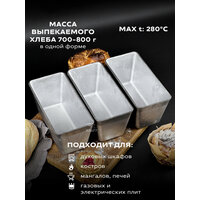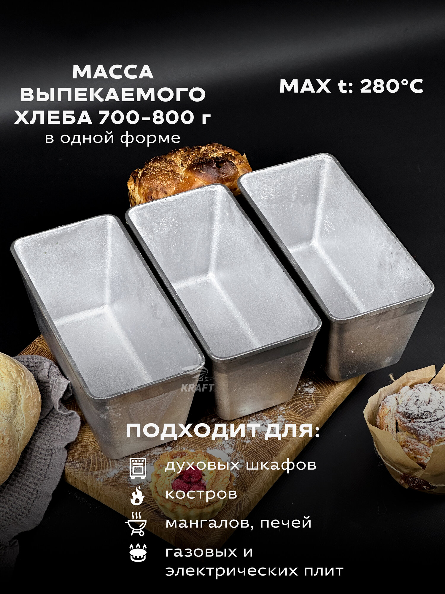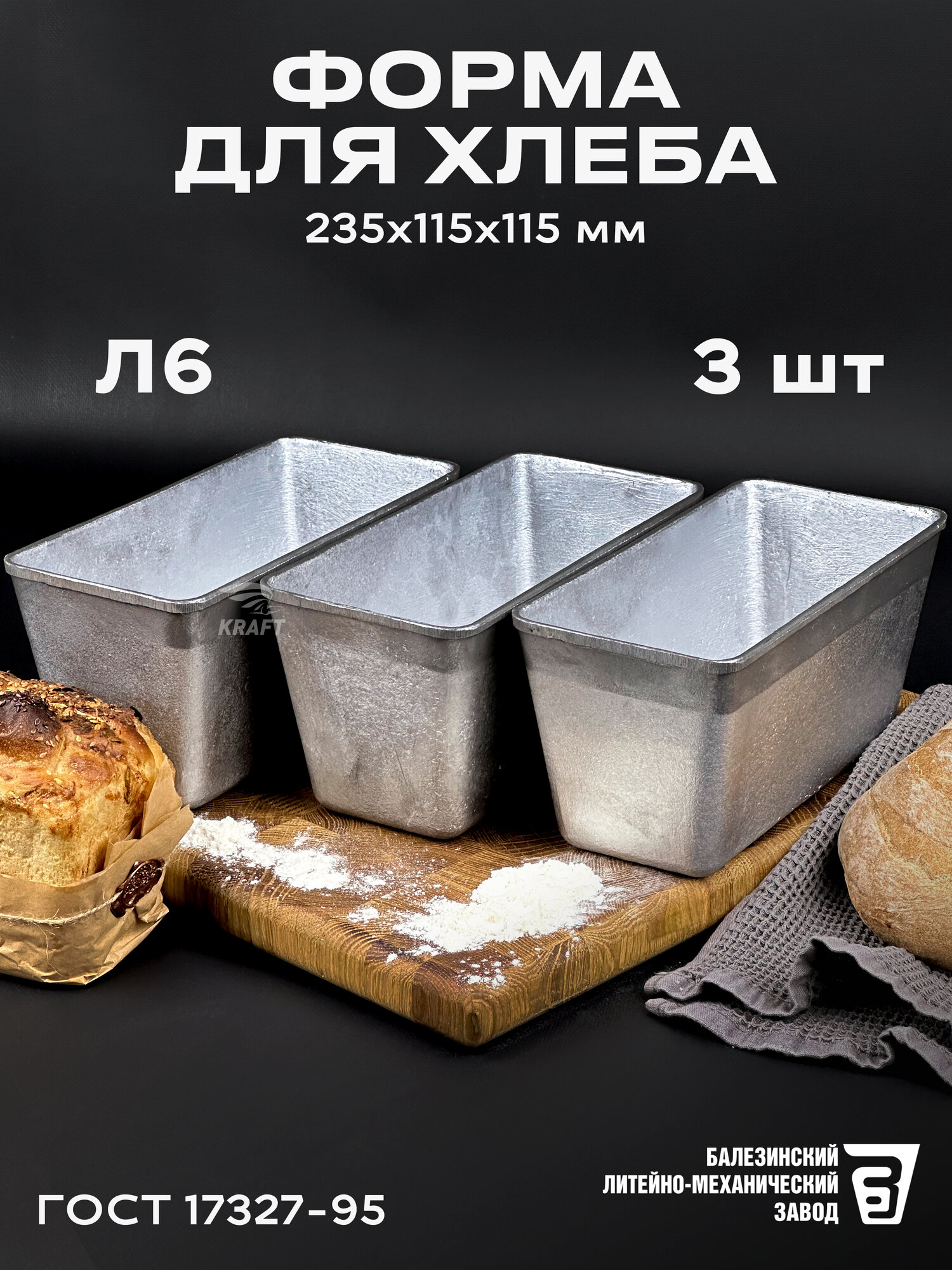 Форма для хлеба алюминиевая Л 6 комплект 3 штуки, размер 235х115х115 мм, масса выпекаемого хлеба 700-800 гр. Хлебная форма изготовлена в соответствии с ГОСТ 17327-95 " Формы хлебопекарные . Технические условия". Форма заводская, может иметь шершавые края, что никак не влияет на качество хлеба. Шершавые края в процессе эксплуатирования нивелируются, либо их можно с легкостью сгладить наждачной бумагой. Перед первым использованием форму для хлеба необходимо прокалить с масляным слоем на внутренней поверхности, инструкция для первого использования в фотографиях. Алюминиевые формы для хлеба известны своей практичностью, ведь алюминий обладает высокой коррозийной устойчивостью и такая форма для выпечки хлеба прослужит не одно десятилетие. А за счет того, что хлебопекарная форма из алюминия имеет свойство быстрого и равномерного нагрева, корочка хлеба получается толстой и хорошо пропеченной, именно такую корочку, мы ели в детстве, возвращаясь из хлебного. Подходит для выпечки как в газовой духовке, так и в электрической печи, или печи на дровах. Прямоугольная форма для выпечки образует красивые, ровные буханки пшеничного, ржаного хлеба. Используйте собственную рецептуру, добавляя в хлеб семечки, злаки, сухофрукты. Форма для хлеба. Алюминиевая, литая форма для выпечки хлеба Л 6 долговечна и сохраняет форму буханки, проста и понятна в использовании, подходит для производства хлебобулочных изделий и для домашнего пользования.